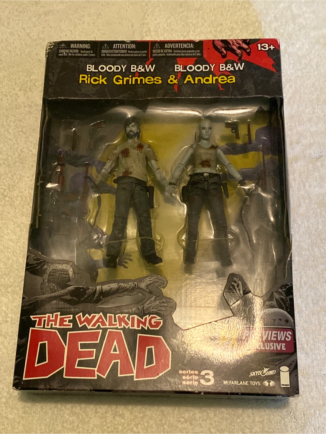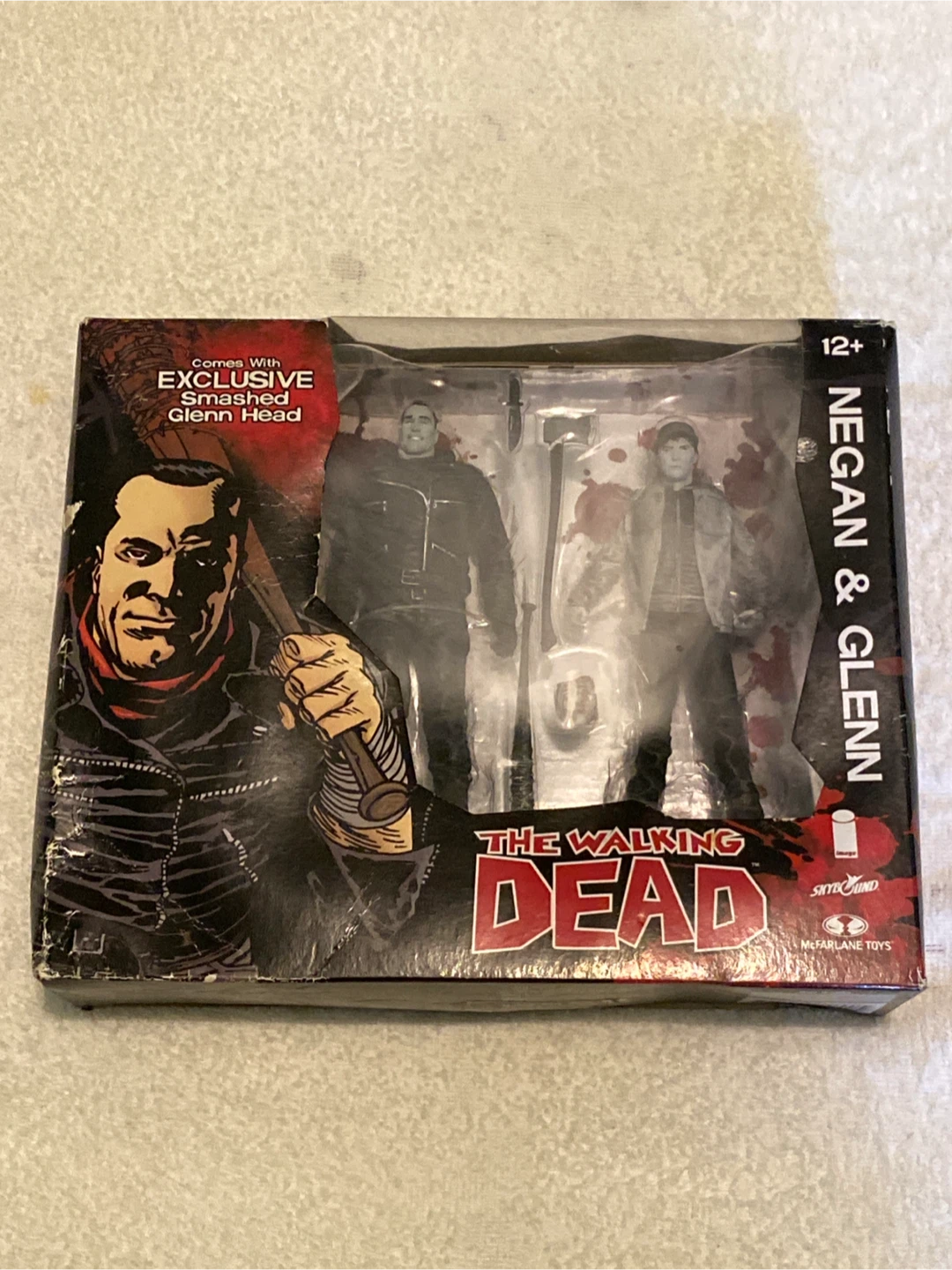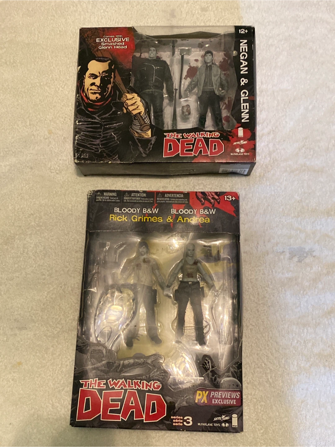 Two sets of collectible action figures from The Walking Dead series. Includes Negan & Glenn, and Rick Grimes & Andrea figures. Great for fans of the show!