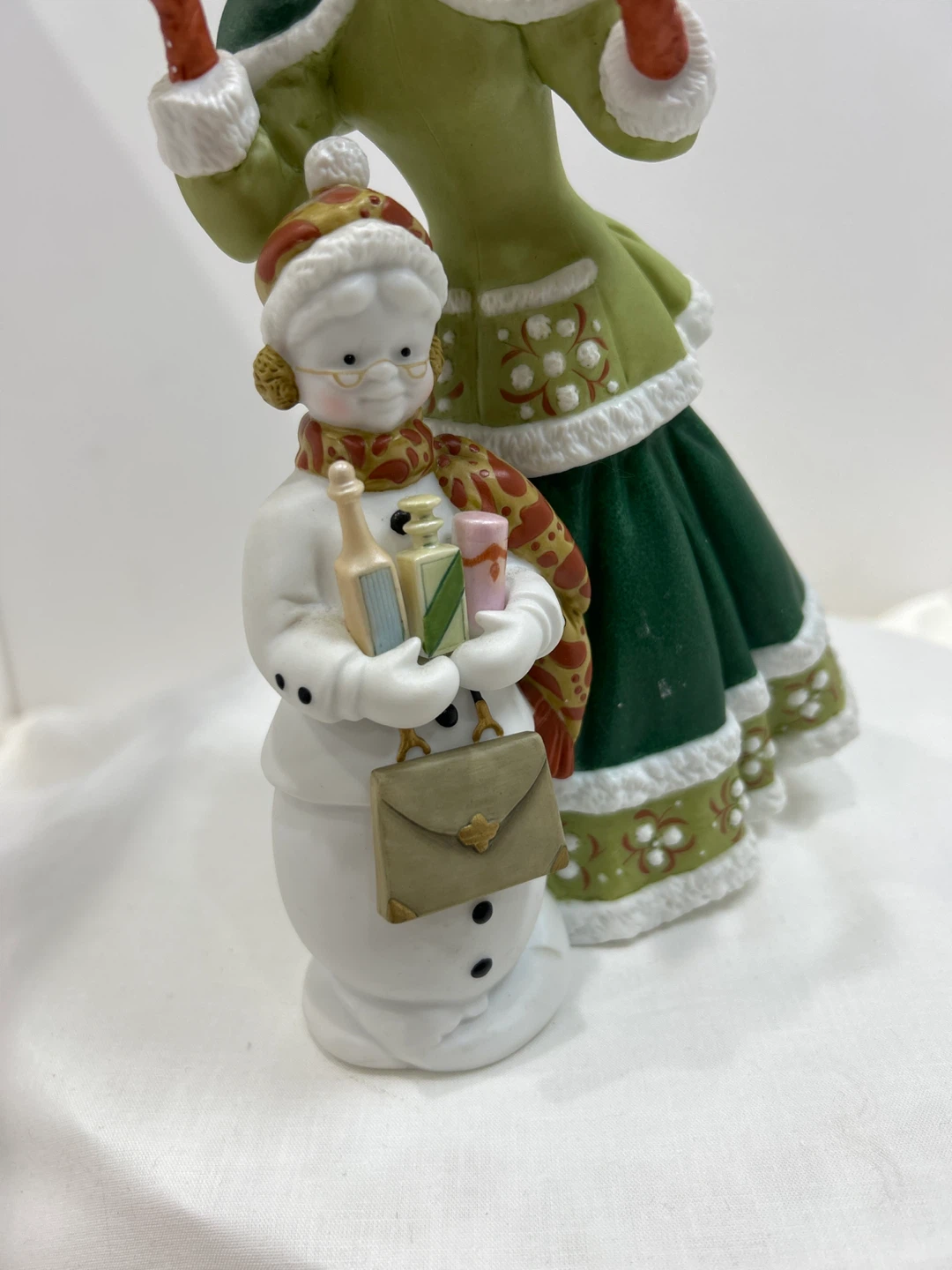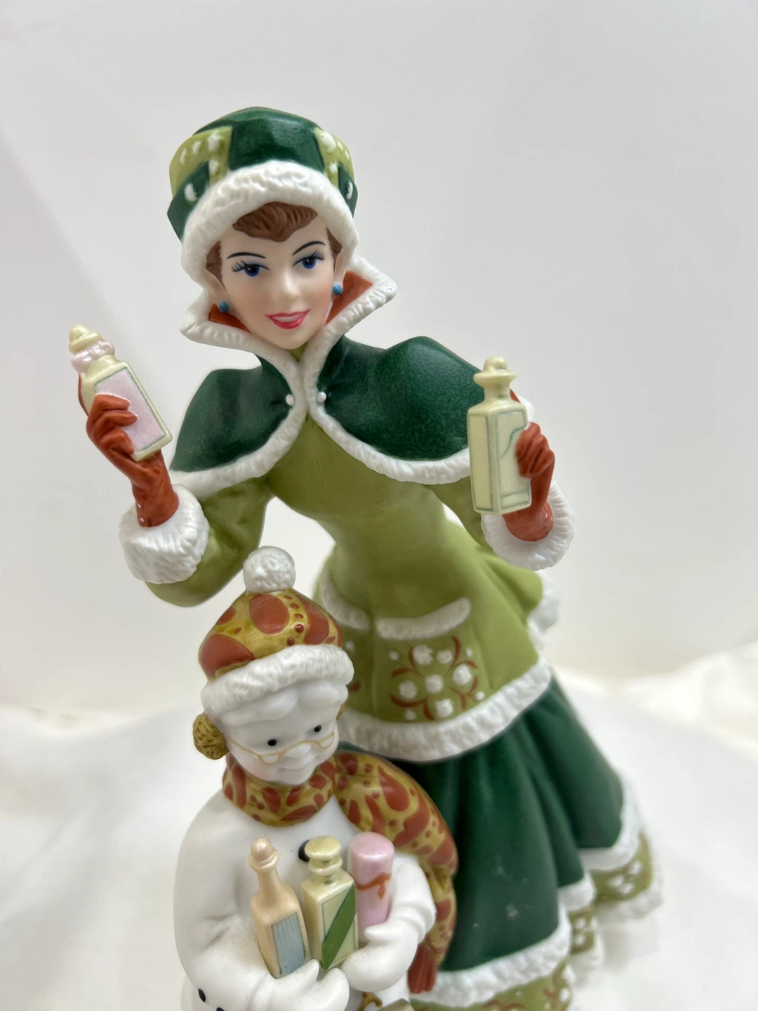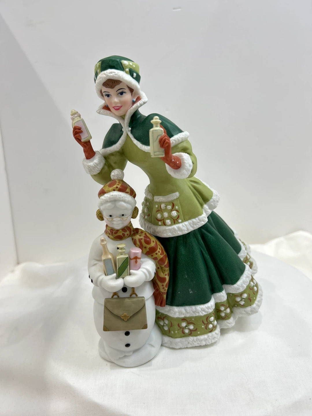 2003 Avon Mrs Albee presidential club award porcelain collectible figurine . This festive porcelain figurine depicts a woman in a green winter coat holding gifts, with a snowman at her feet also holding gifts. π