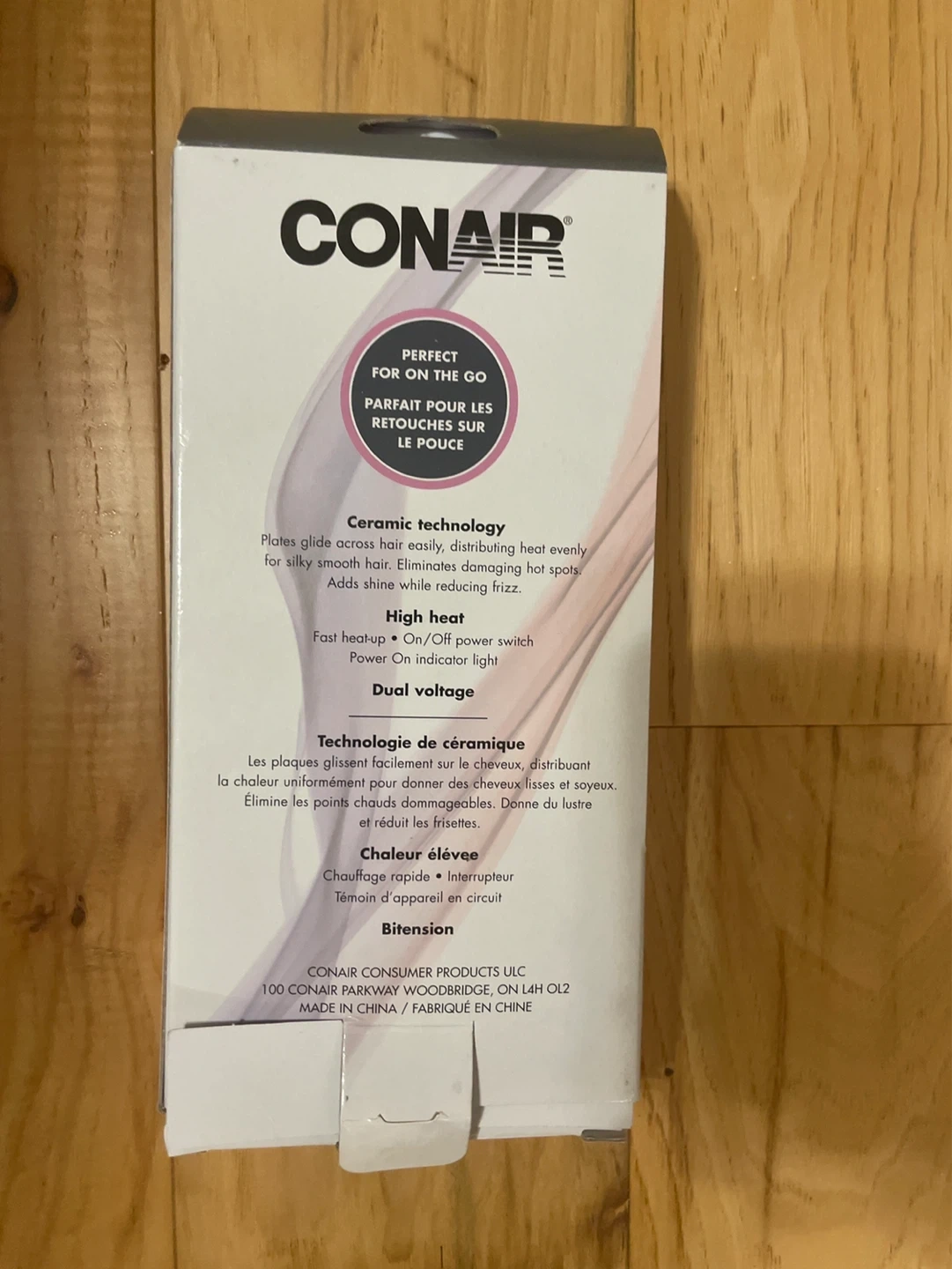 Only used once! This Conair mini straightener has 1/2 inch plates. It features ceramic technology for smooth, frizz-free hair. High heat and dual voltage make it perfect for on-the-go touch-ups!