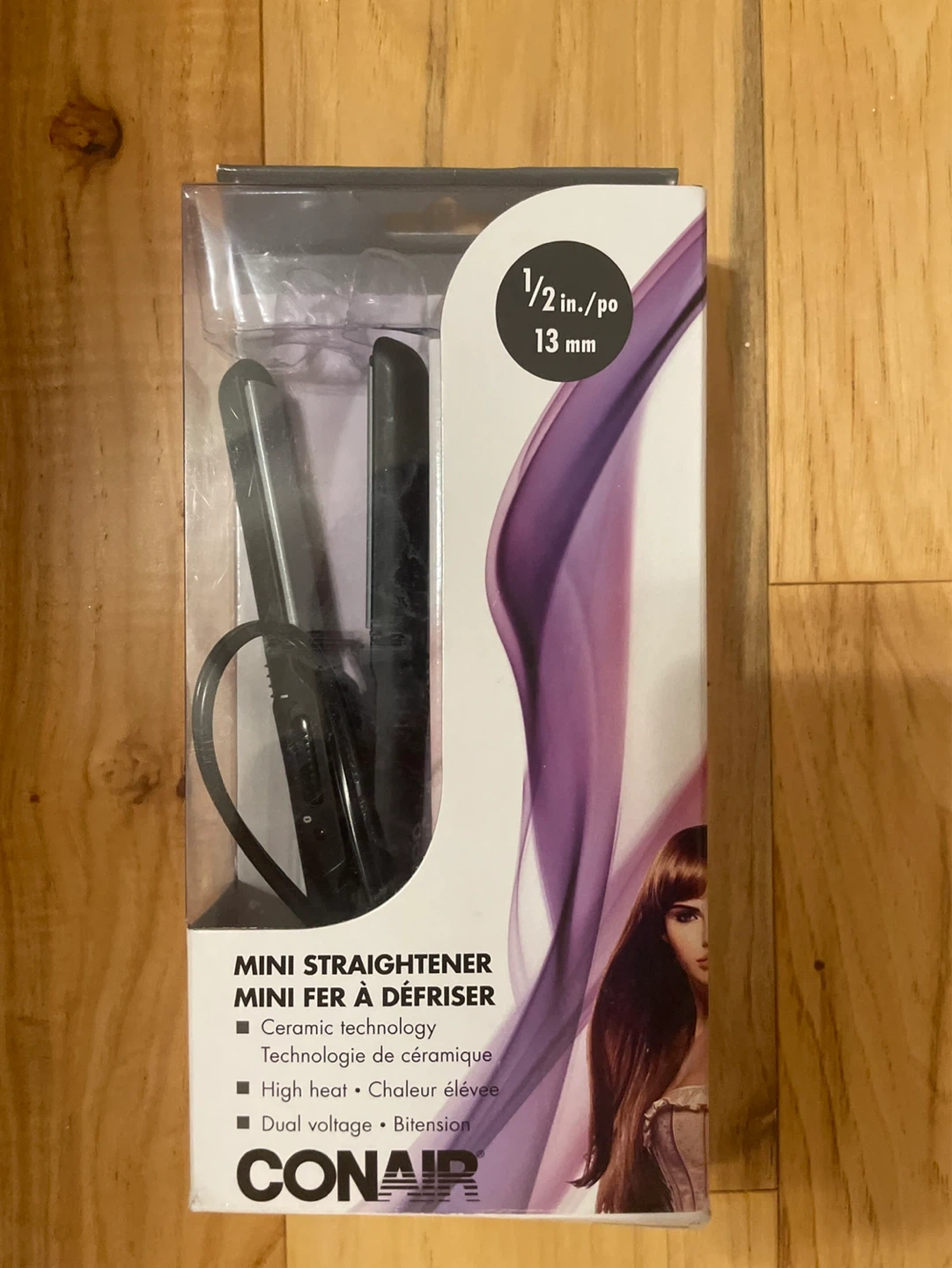 Only used once! This Conair mini straightener has 1/2 inch plates. It features ceramic technology for smooth, frizz-free hair. High heat and dual voltage make it perfect for on-the-go touch-ups!