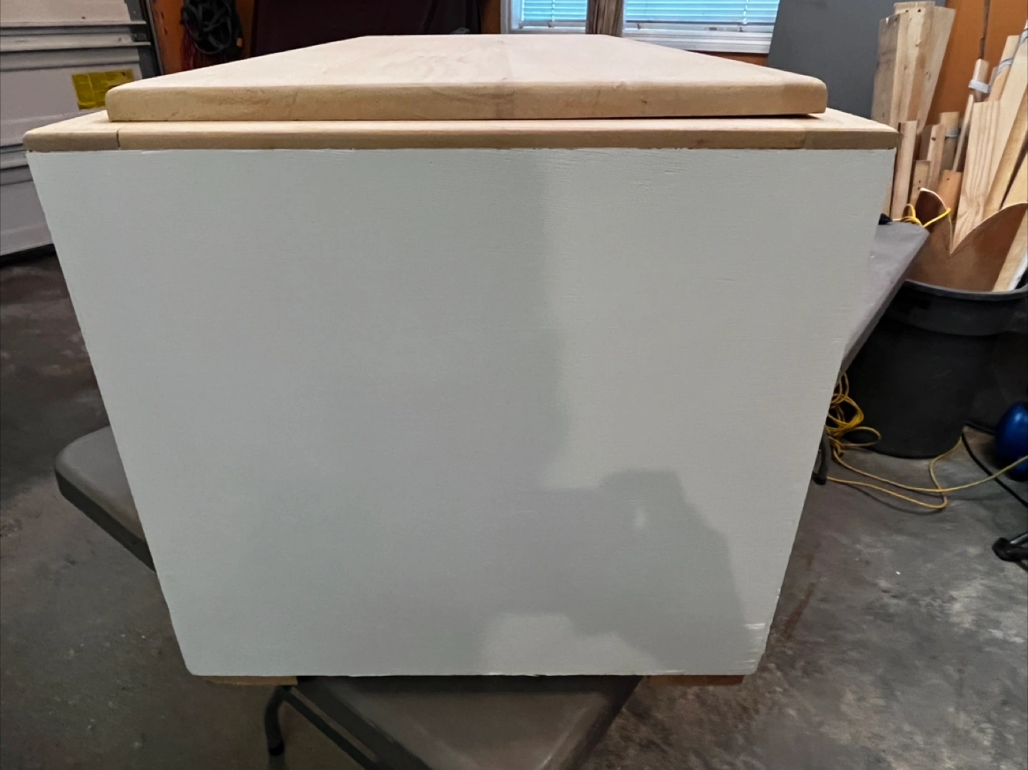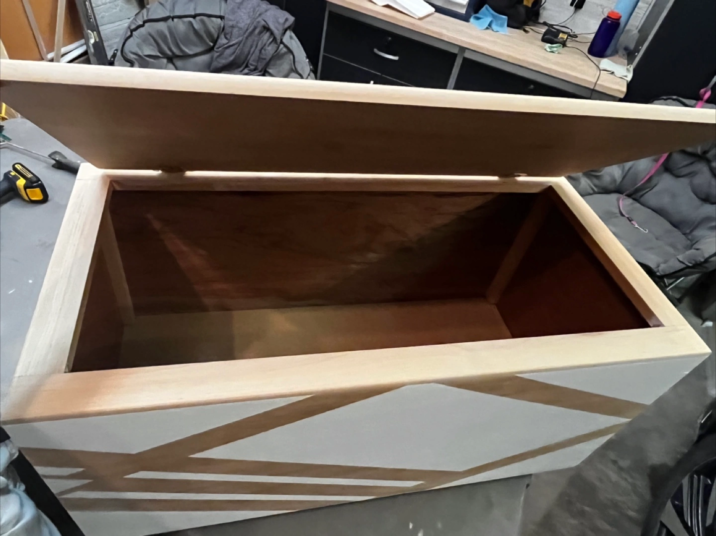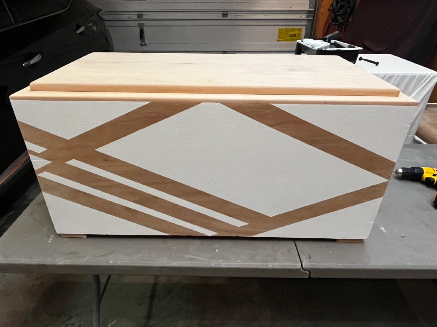 Selling a wooden storage box, painted white with a natural wood lid and geometric design on the front. It's sturdy and in good condition, perfect for storing various items around the house!