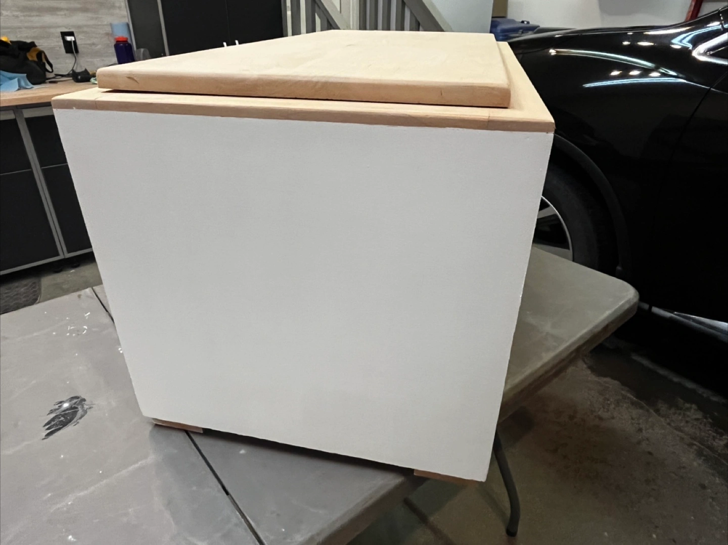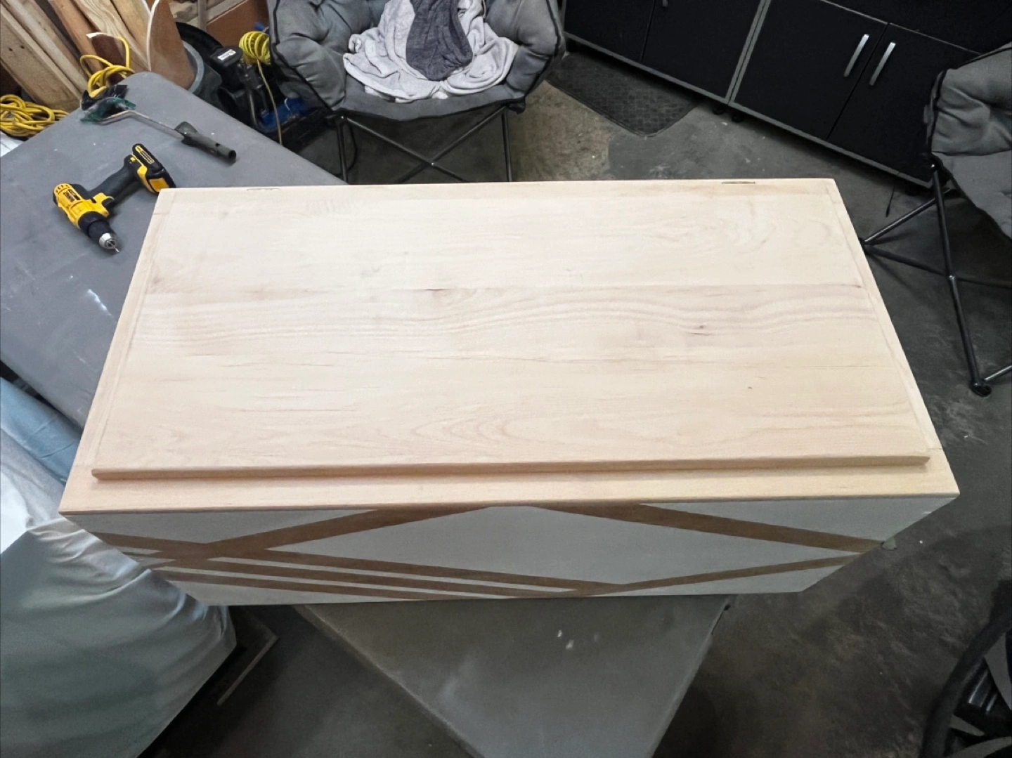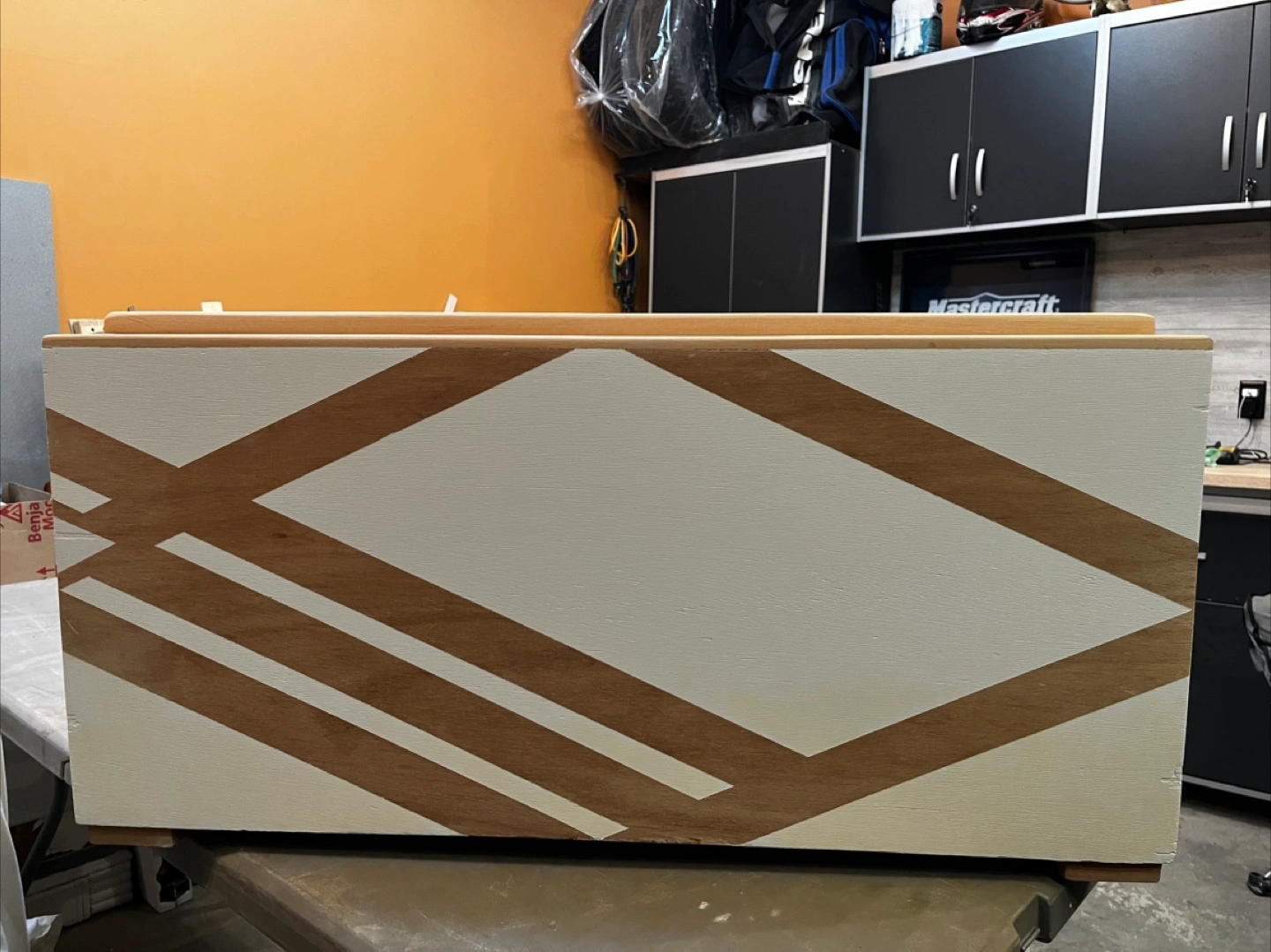Selling a wooden storage box, painted white with a natural wood lid and geometric design on the front. It's sturdy and in good condition, perfect for storing various items around the house!