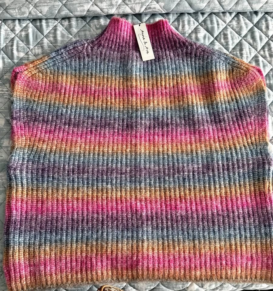 The knit top with a pink, purple, blue, grey, yellow, and orange Rainbow stripe pattern is by the brand Anna & Ara.
