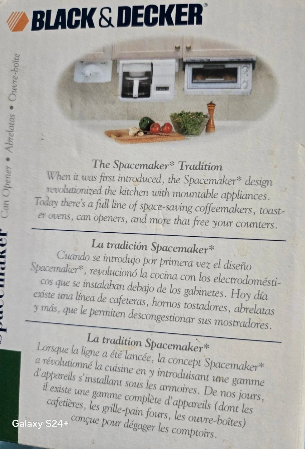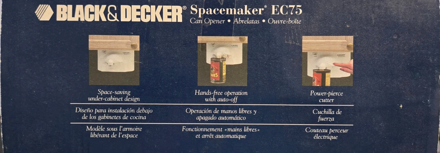 This is a BLACK+DECKER Spacemaker EC75 can opener. It features a space-saving under-cabinet design with hands-free operation and a power-pierce cutter. The blade is also removable for easy cleaning.