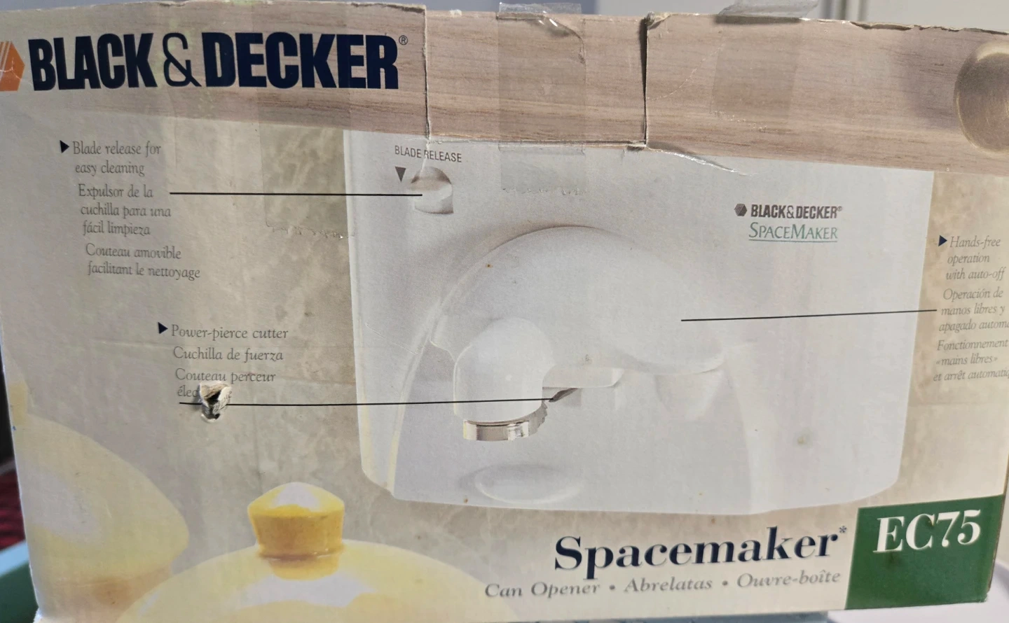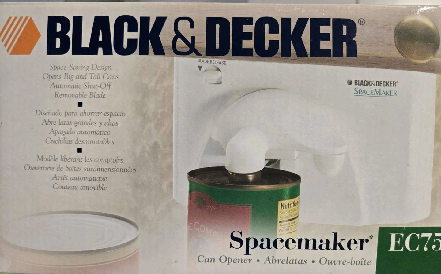 This is a BLACK+DECKER Spacemaker EC75 can opener. It features a space-saving under-cabinet design with hands-free operation and a power-pierce cutter. The blade is also removable for easy cleaning.