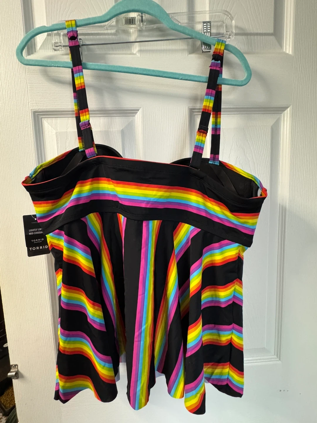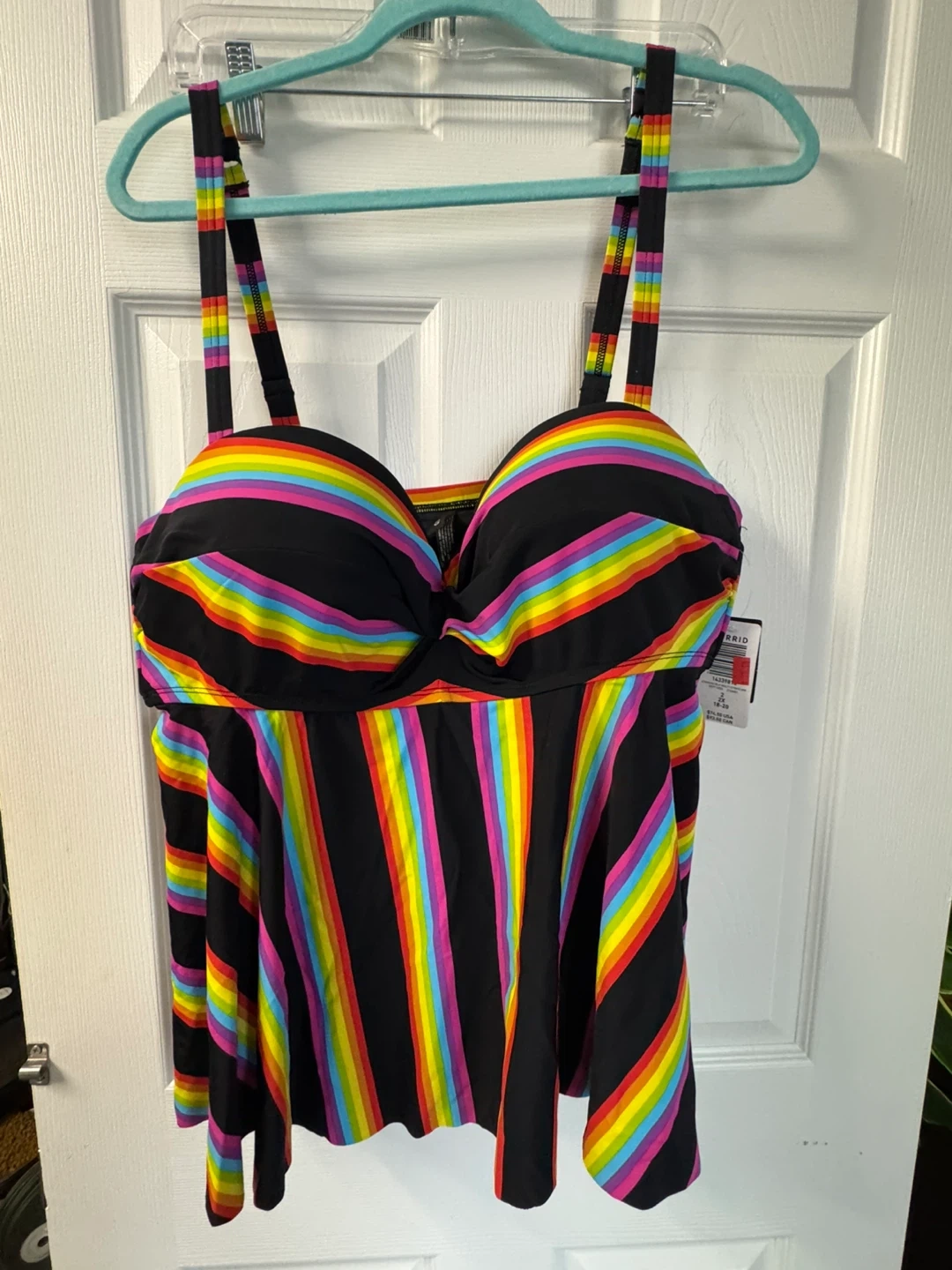 This Torrid tankini top features a black base with a vibrant rainbow stripe pattern. It's a size 2X, fitting a 18-20 size range. Includes adjustable straps for a comfortable fit.