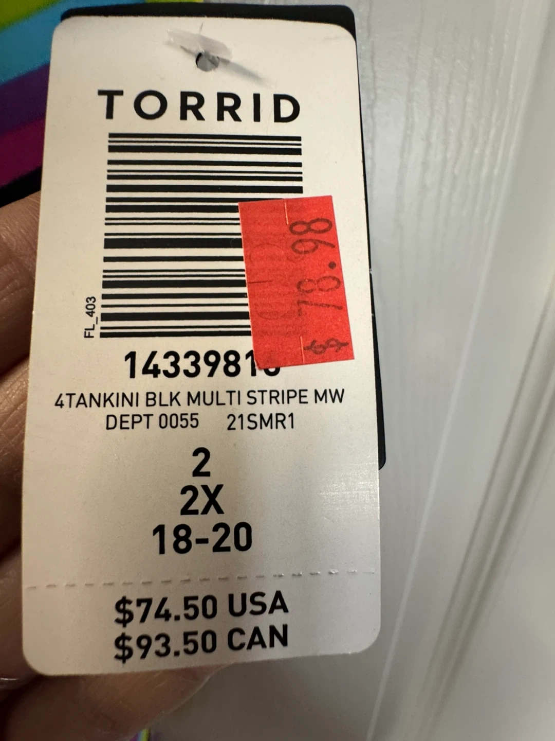 This Torrid tankini top features a black base with a vibrant rainbow stripe pattern. It's a size 2X, fitting a 18-20 size range. Includes adjustable straps for a comfortable fit.