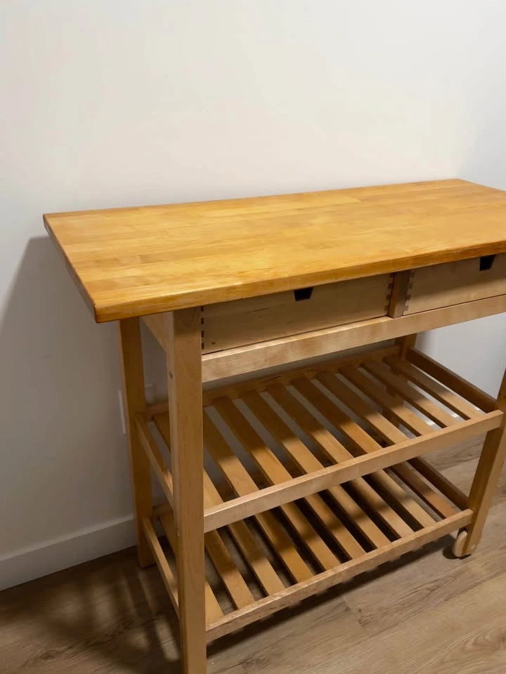 15Selling my IKEA FÖRHÖJA bar cart, used but in great condition. Top has been oiled as recommended by IKEA to protect the wood and keep it looking great. Only selling because we rearranged our space and no longer need it. Dimensions: Length: 39 3/8”, Depth: 16 7/8”, Height: 35 3/8”. Pickup near Phibbs Exchange, North Vancouver. Retails for $199 + tax at IKEA. Asking $150