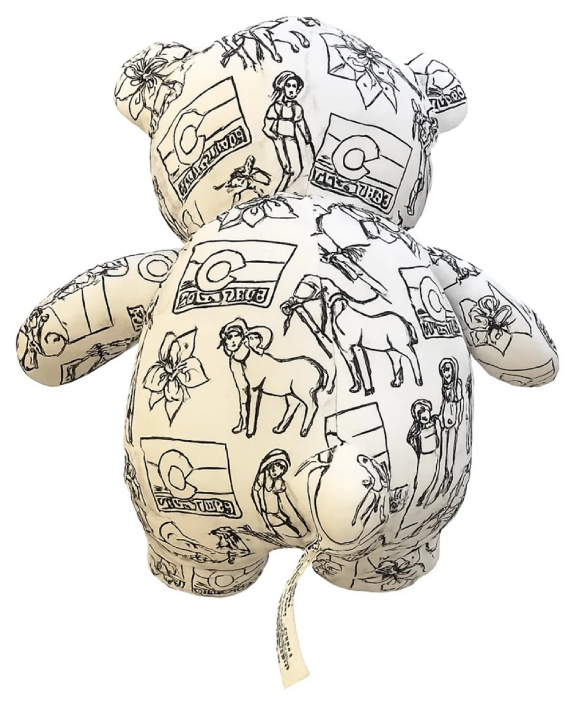 Color Me Plush Colorado bear by The RGU Group (2022). Features iconic Colorado illustrations — state flag, wildlife, flowers, and cultural motifs — printed across soft fabric. Designed to be coloured in, making it a fun keepsake, gift, or display piece.