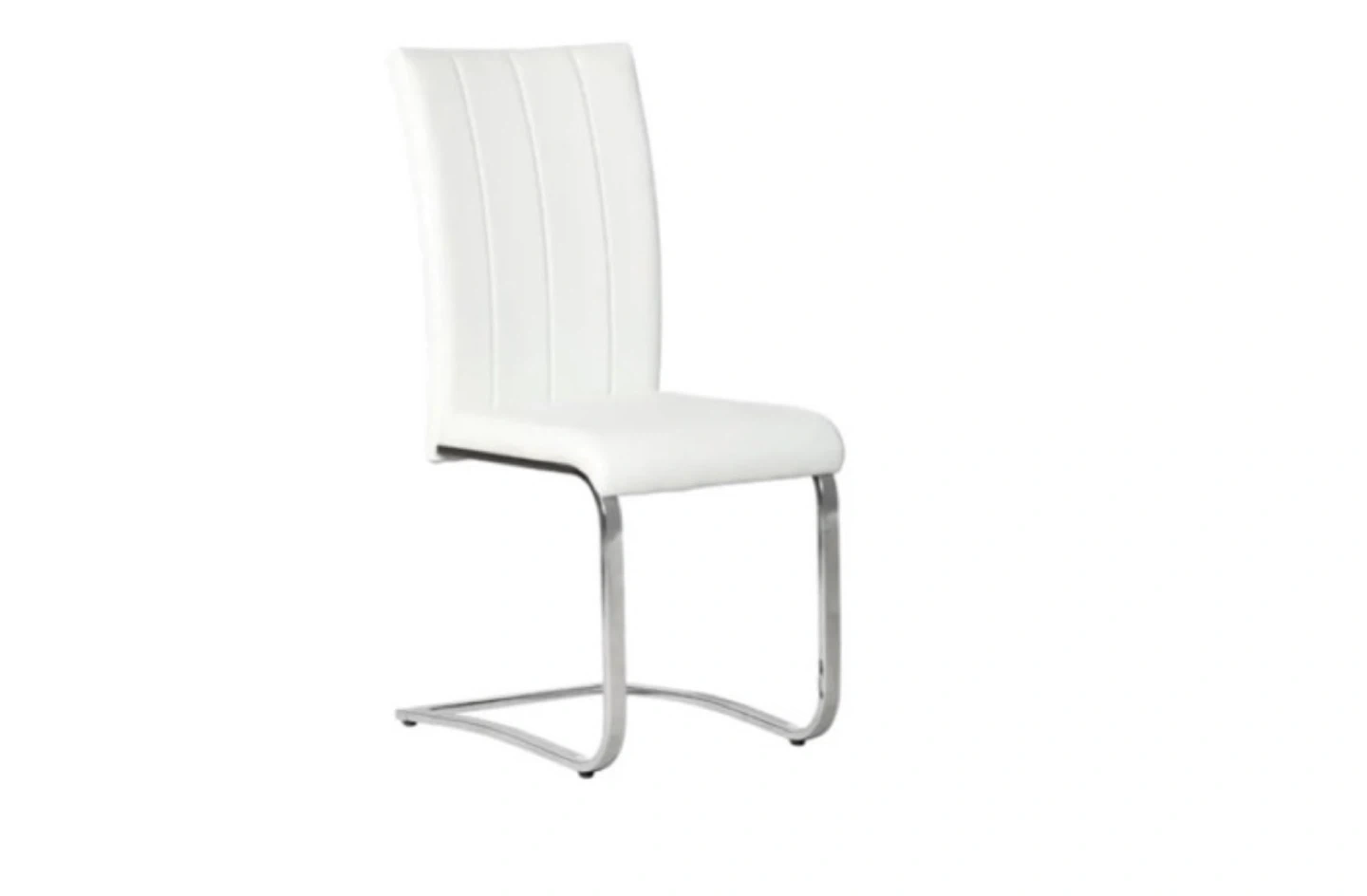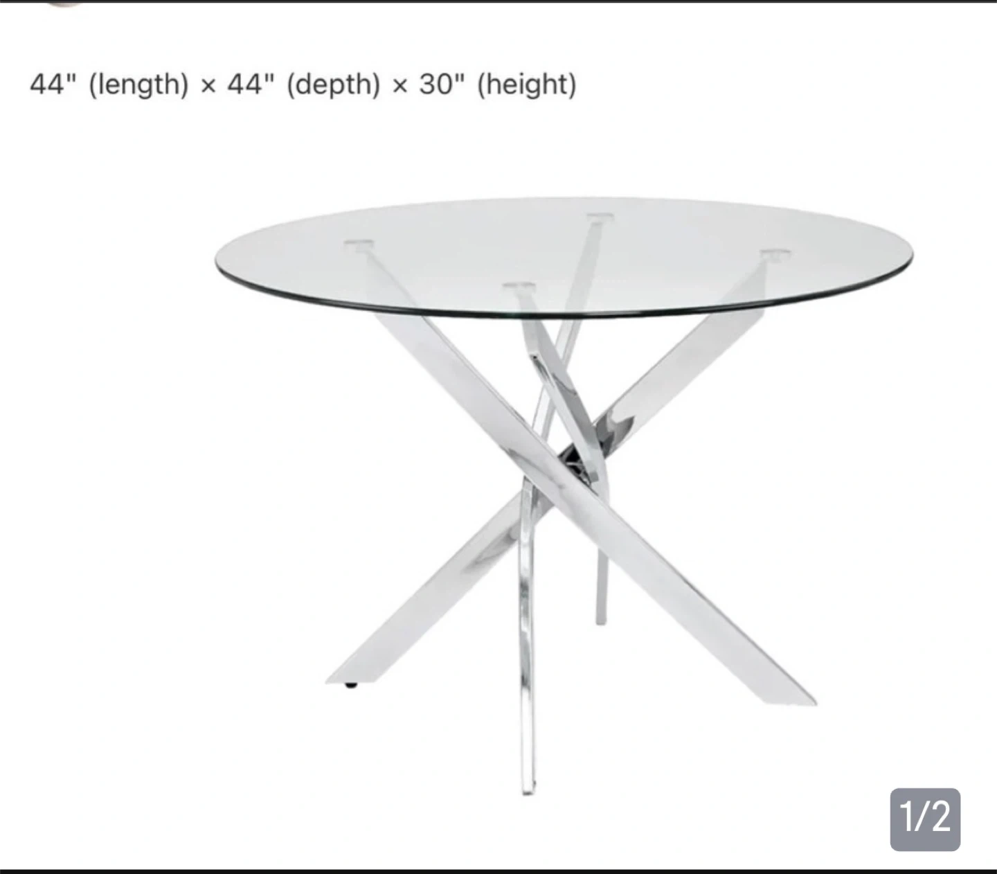This dining set features a modern glass-top table with a sleek chrome base. It comes with two stylish white faux leather chairs with chrome legs. Table dimensions are 44" L x 44" D x 30" H. It's a compact set suitable for smaller dining areas.