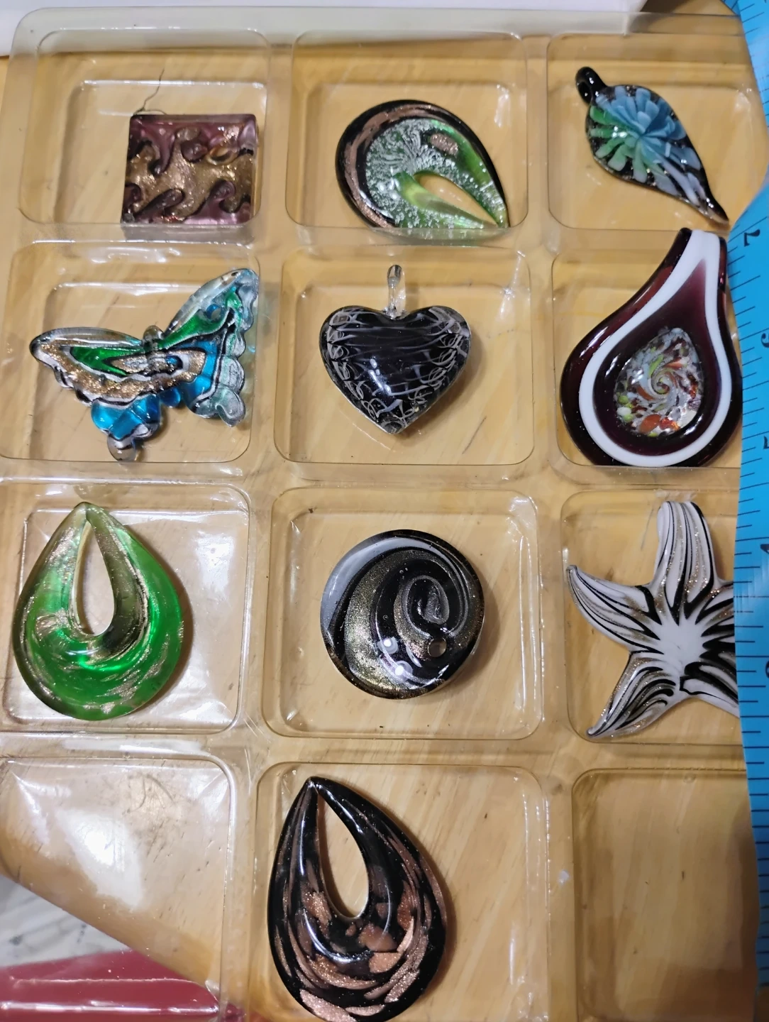 A collection of unique glass pendants featuring various designs and colours. These handcrafted pieces are perfect for jewellery making. Each pendant is made of glass and showcases intricate patterns.