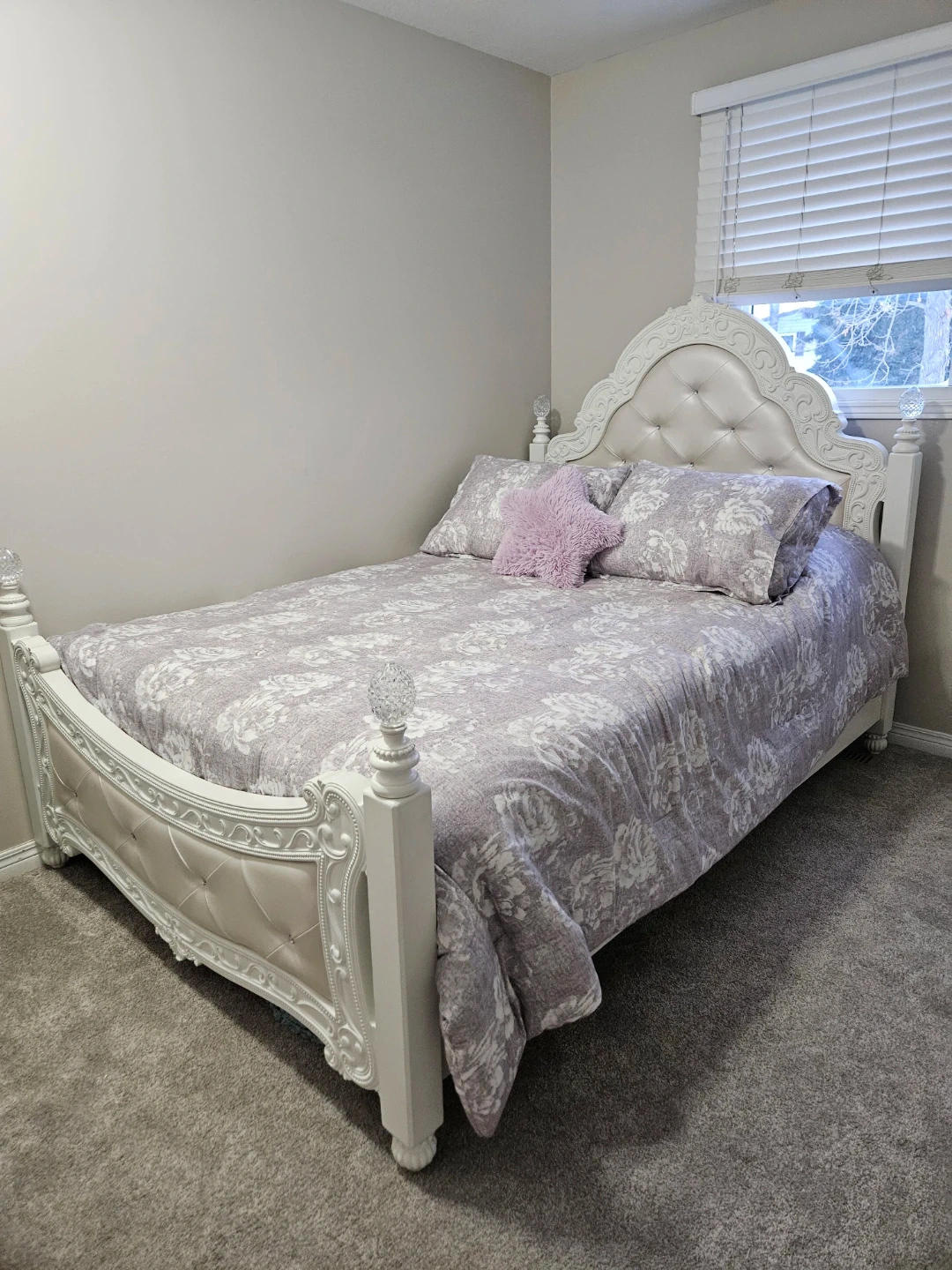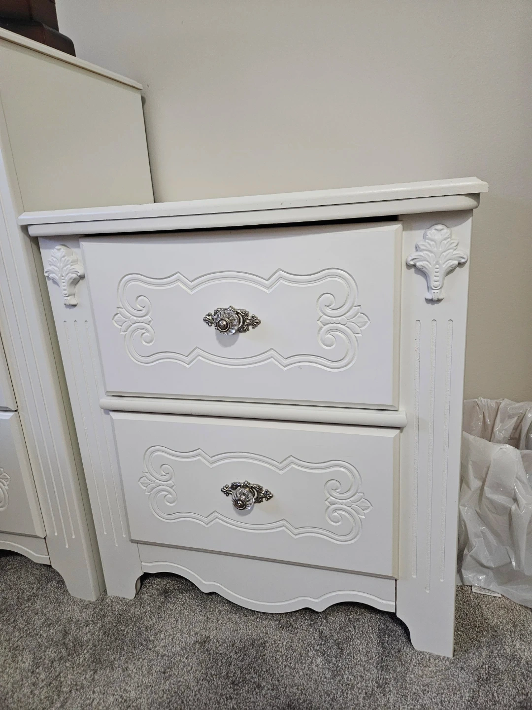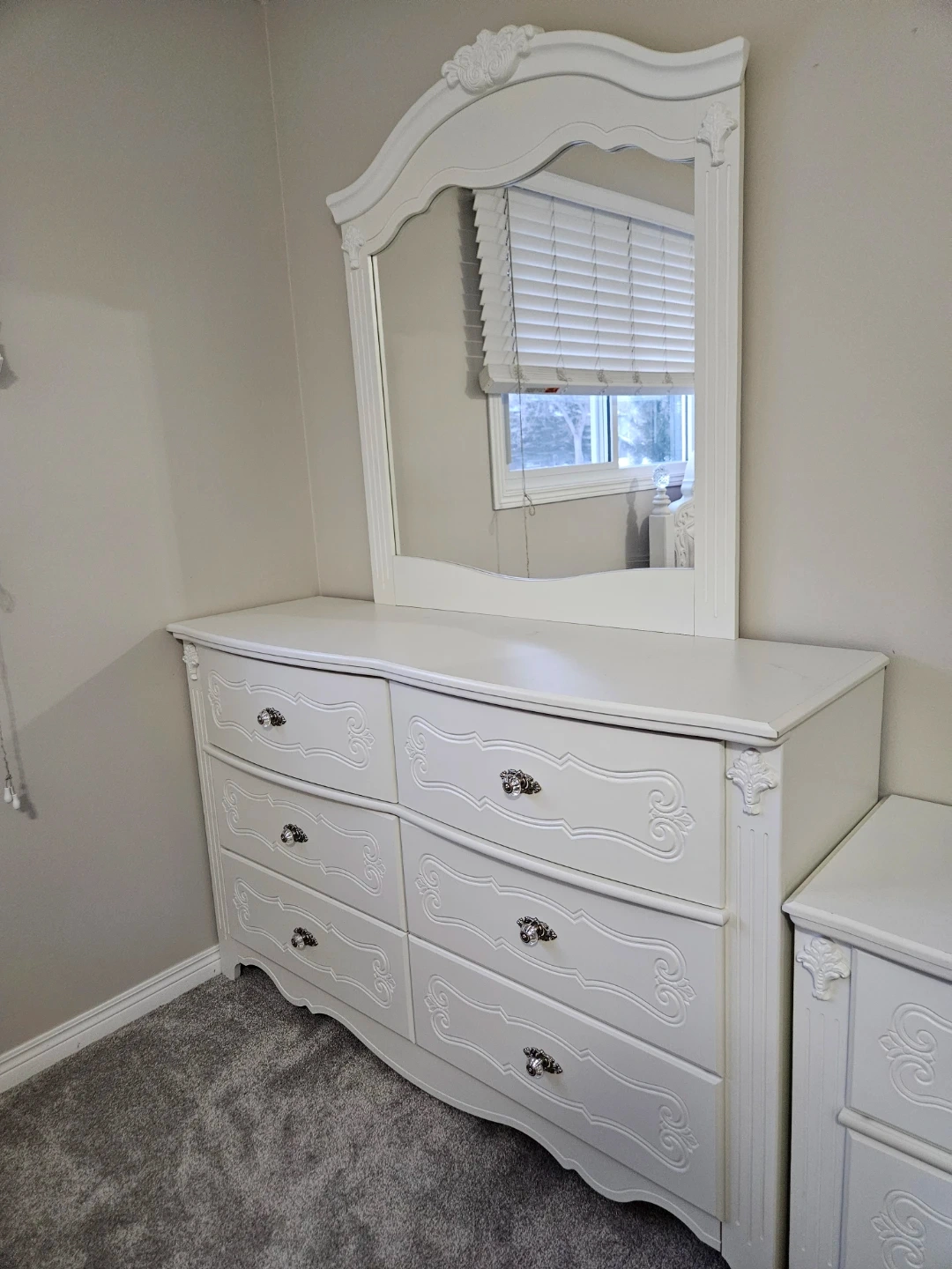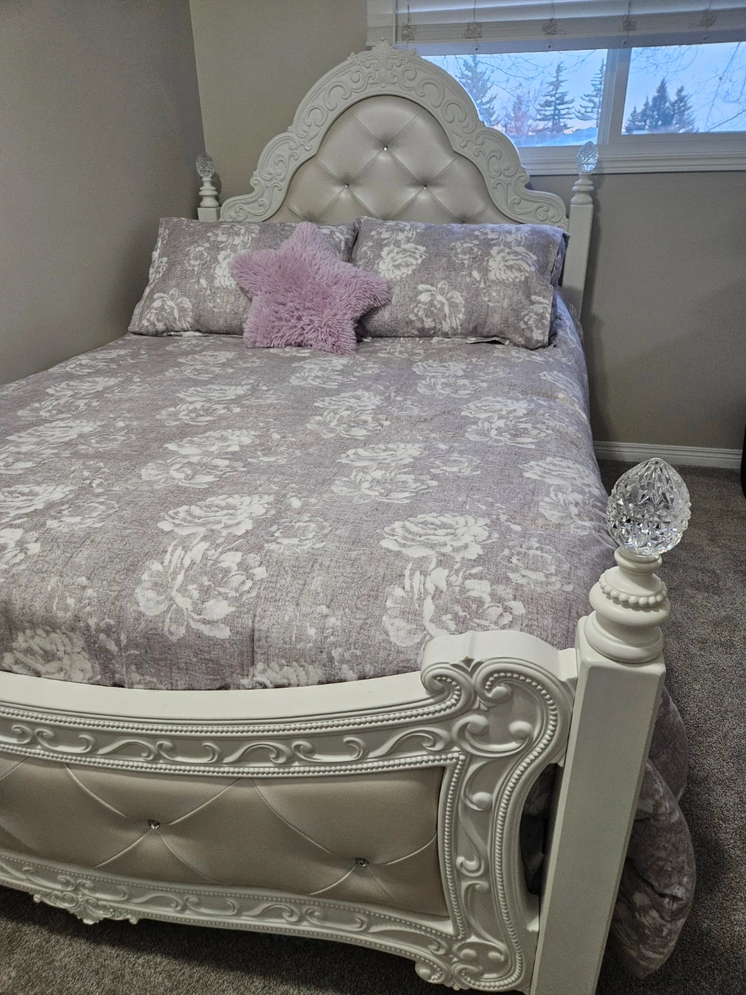 A beautiful white Full bed with tufted headboard and crystal finials. Includes matching 6 drawer dresser mirror included and 2 nightstands. Elegant scrolled details on all pieces.