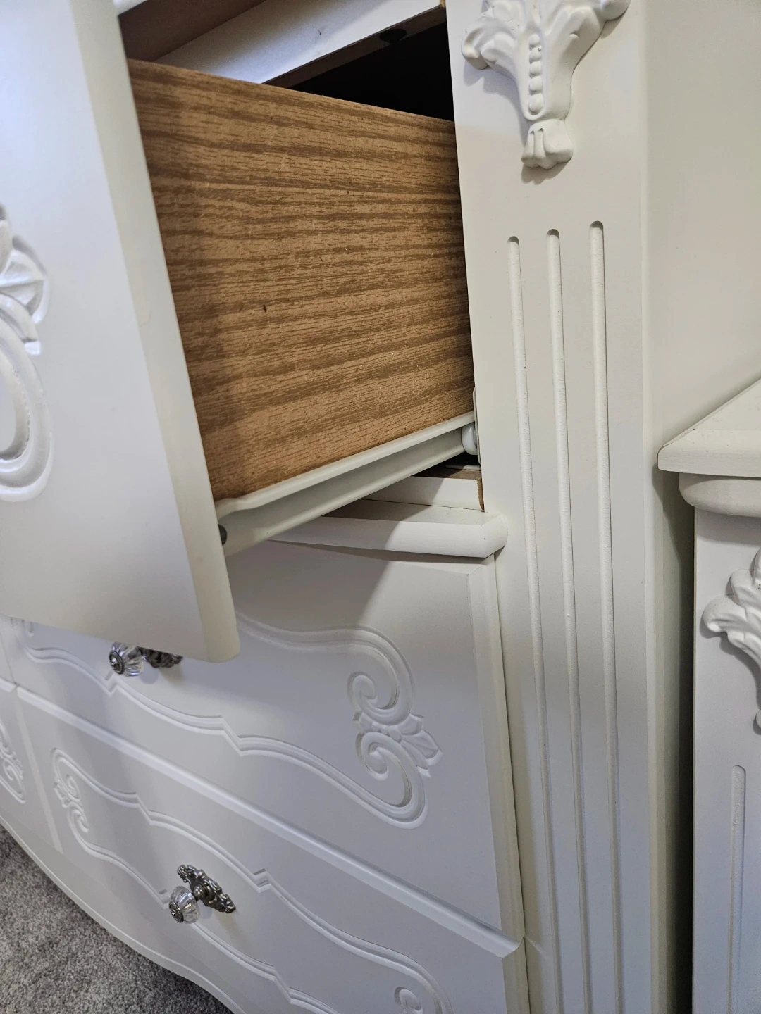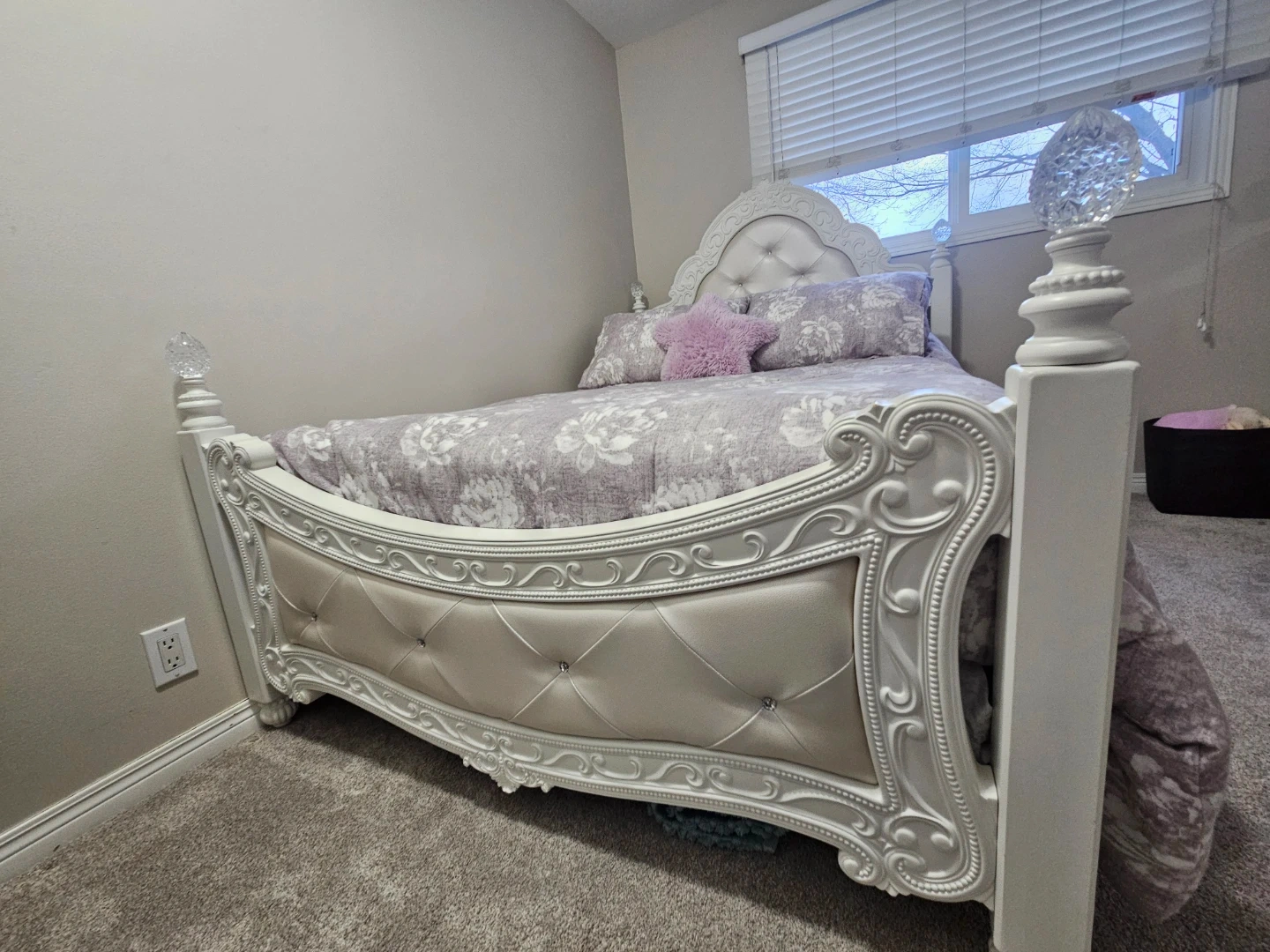 A beautiful white Full bed with tufted headboard and crystal finials. Includes matching 6 drawer dresser mirror included and 2 nightstands. Elegant scrolled details on all pieces.