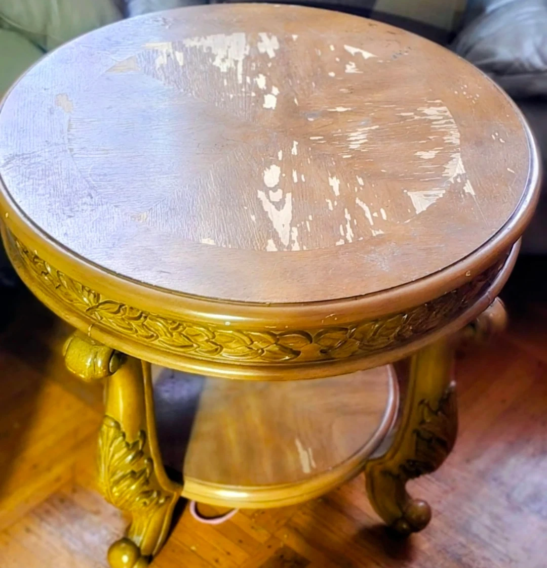 🥕This is a round solid wooden side table. It features ornate carvings on the trim and legs, with a lower shelf for extra storage. The tabletop shows wear and has some scratches as you can see in pic. Made from Good quality Wood.