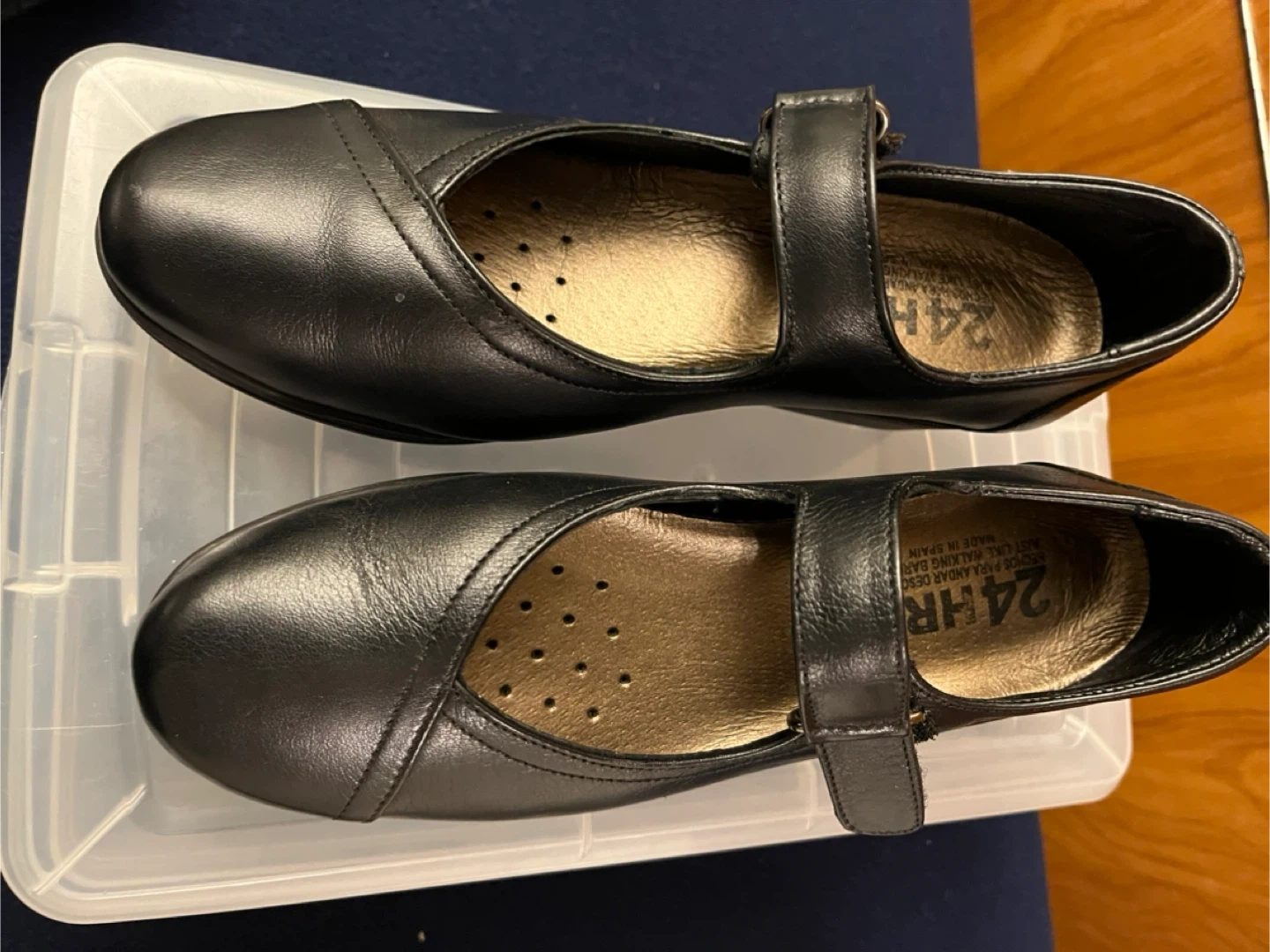 Selling a pair of 24HR Mary Jane style shoes in black leather. They look great for both casual and formal occasions. The shoes are in good condition and ready for a new home!