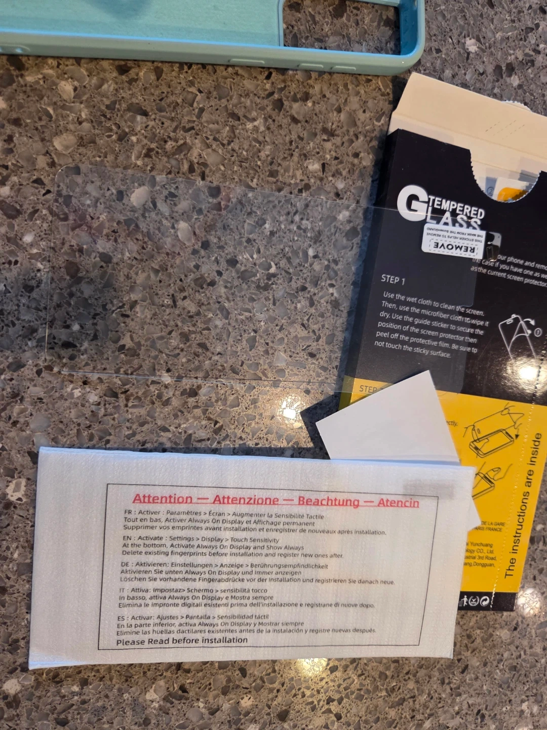 This is a NEW 'C' brand tempered glass screen protector for a Samsung Galaxy S21 5G (6.2"). It's made in China and includes the necessary installation tools. Also included are phone cases: one mint green with a pop socket and one black Spigen case.