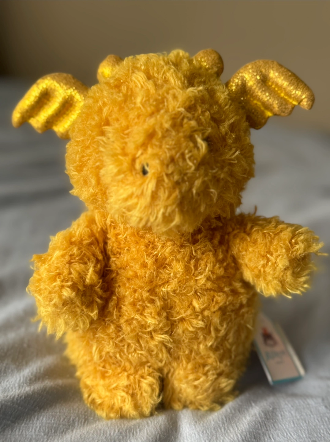 This is a cute, orange, fuzzy plush toy shaped like a dragon. It has sparkly gold wings and is perfect for snuggles. It's made with soft material. 100% real and 100% new with tag.