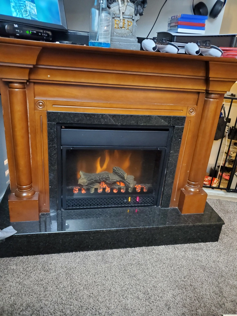 Electric fireplace with a black surround, comes with a black granite base. Includes logs and a remote control asking 275 obo. would like gone asap. will take 200 if gone by the weekend.