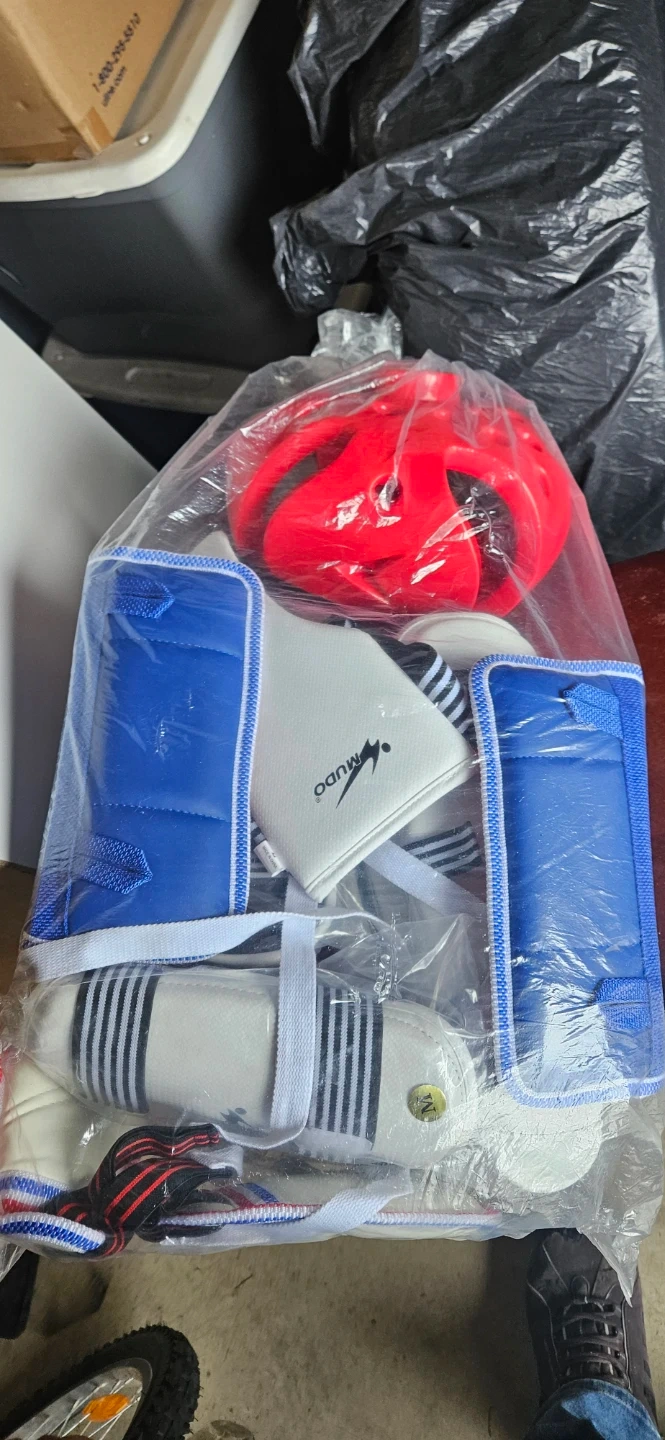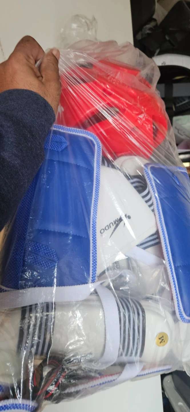 This Mudo Taekwondo gear set includes a red headguard, white and blue padded shin and forearm guards, and white striped foot protectors. It comes in size medium.