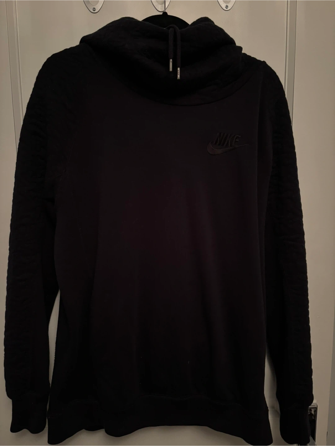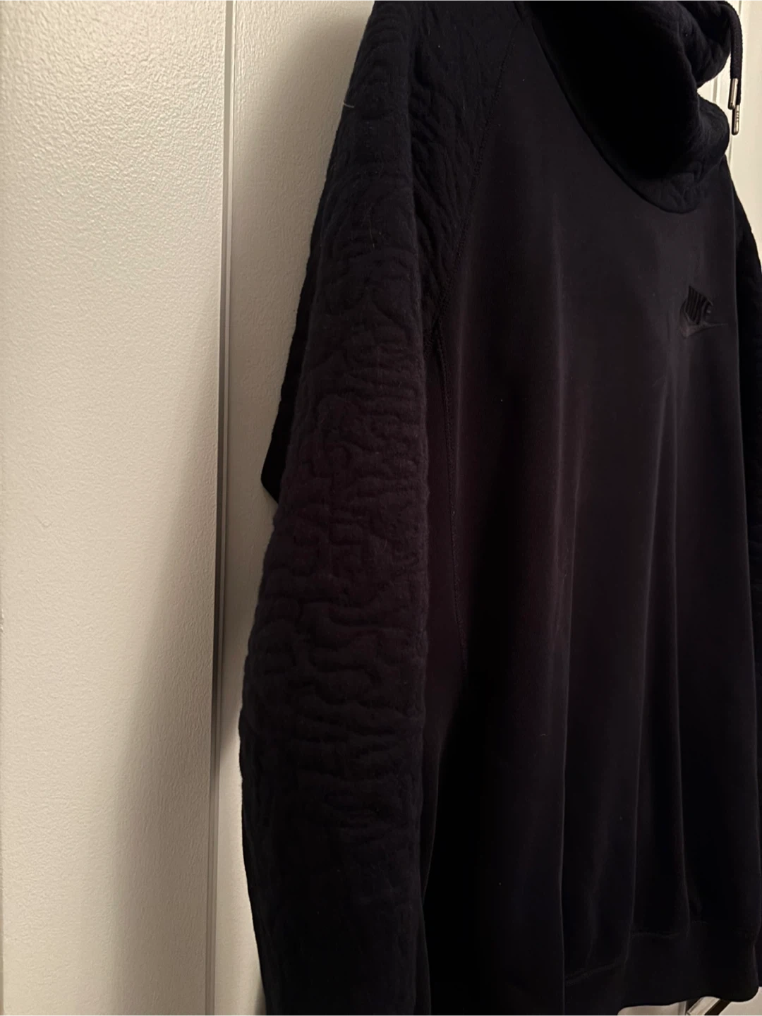 Black Nike hoodie. It's a size medium (fits like a large) with textured sleeves.
