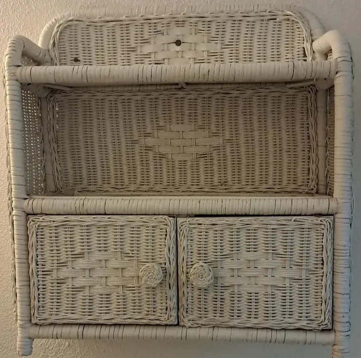 This white wicker shelf features two woven drawers with decorative pull knobs. It has an open top shelf and a woven basket compartment above the drawers. Perfect for storing small items or as decorative storage!