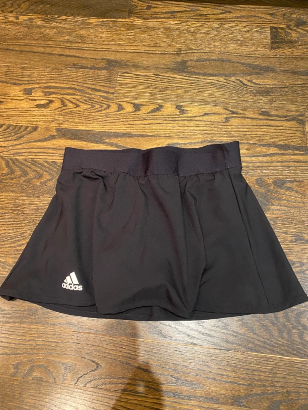 This is an Adidas black tennis skirt. It's made of a lightweight, breathable fabric. The elastic waistband ensures a comfortable fit. Perfect for sports or casual wear!