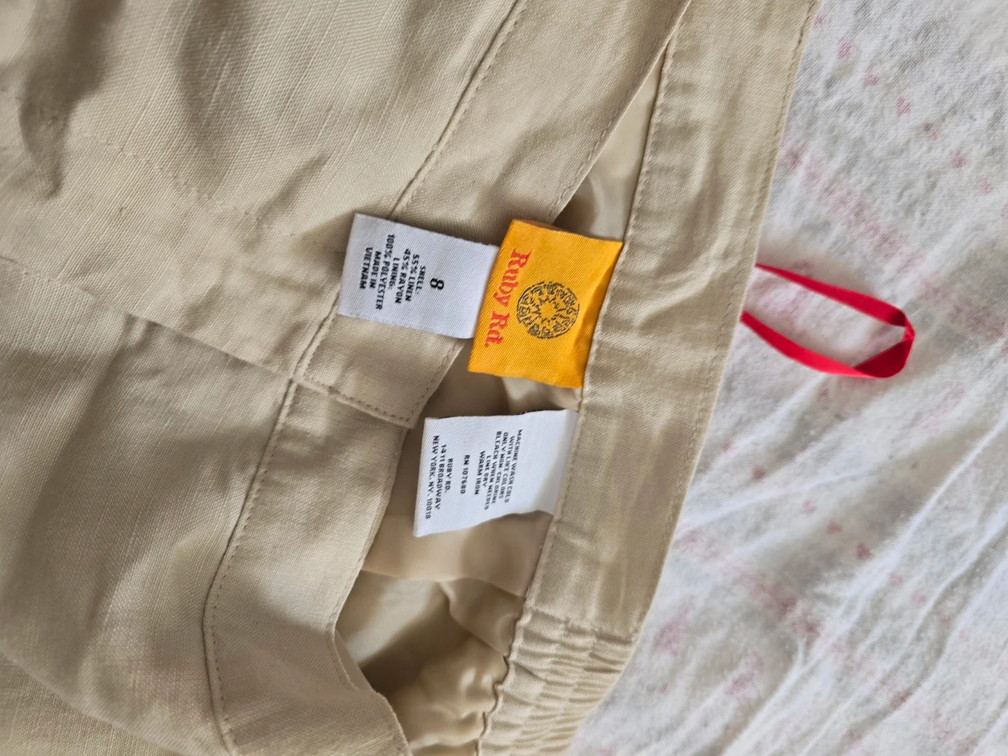 These Ruby Rd. pants are a size 8 and made from a linen blend. They feature an elastic waistband .It lined for ease of wear and the material . Pics taken under natural light.