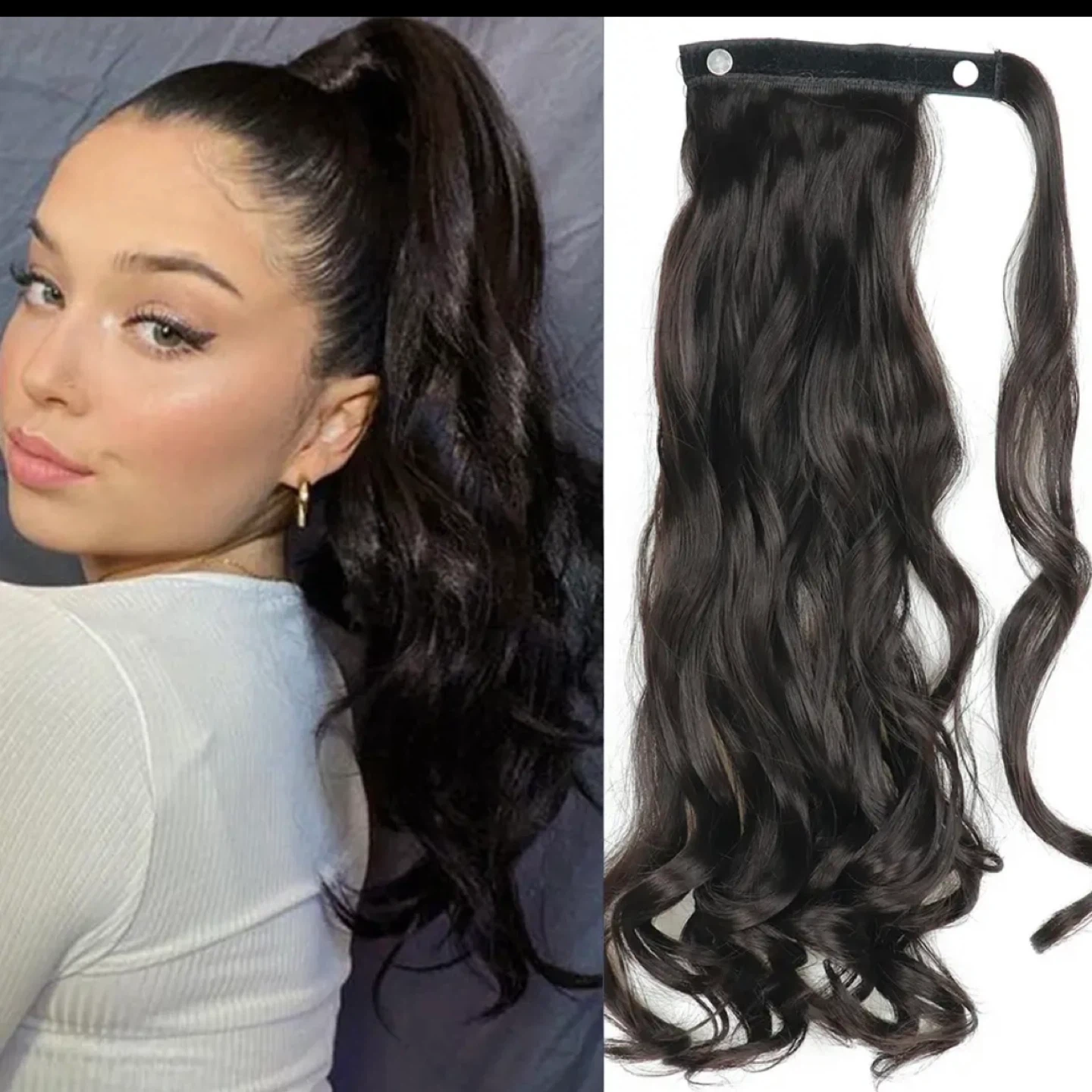 This is a dark brown, wavy ponytail extension. It's designed for easy clip-in application and adds instant length and volume. The material appears to be synthetic. This extension can help you achieve a fuller, longer hairstyle quickly!