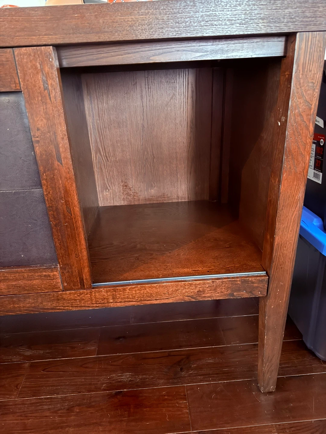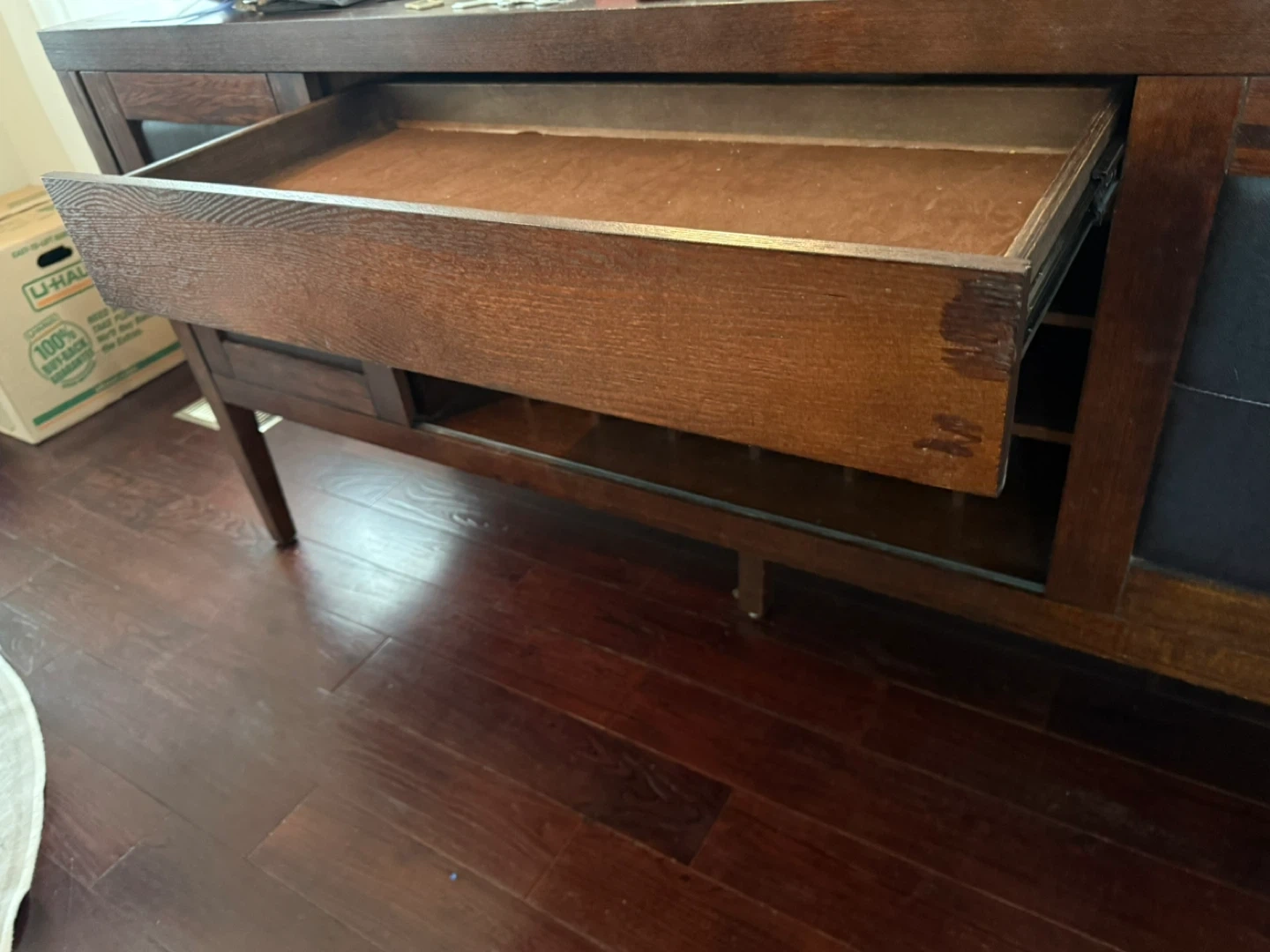 This beauty of a side board is solid wood. Measurements are 70 long, 19.5 deep and 33.5 tall. Can’t take it with us on our move.
