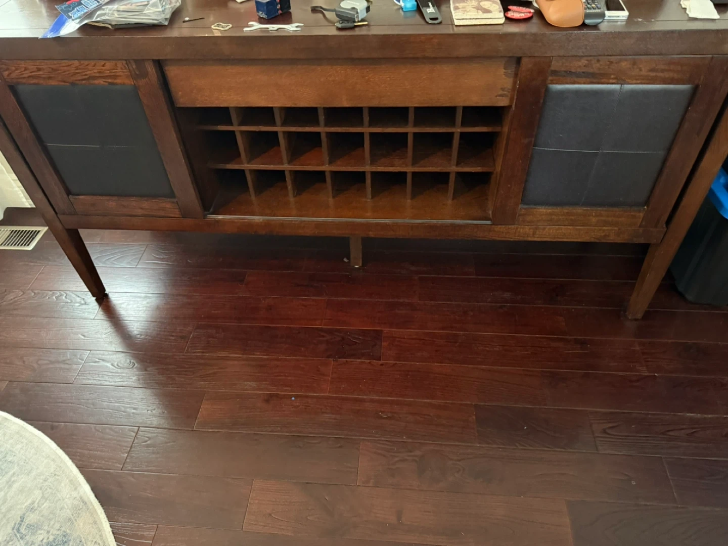 This wooden sideboard offers ample storage with its divided compartments and a convenient drawer. It features a built-in wine rack perfect for organizing bottles. The dark wood finish complements many decors.