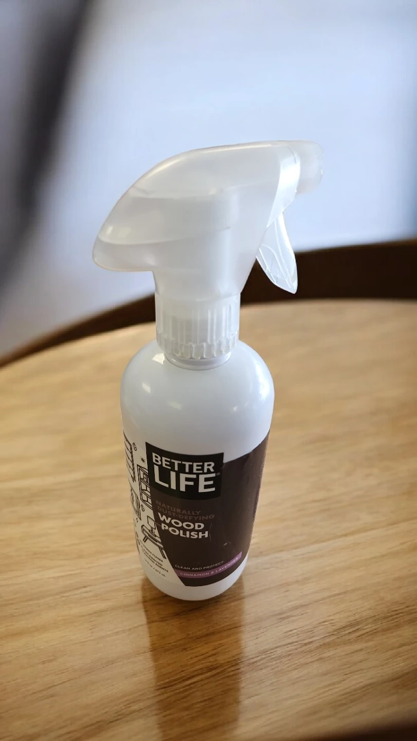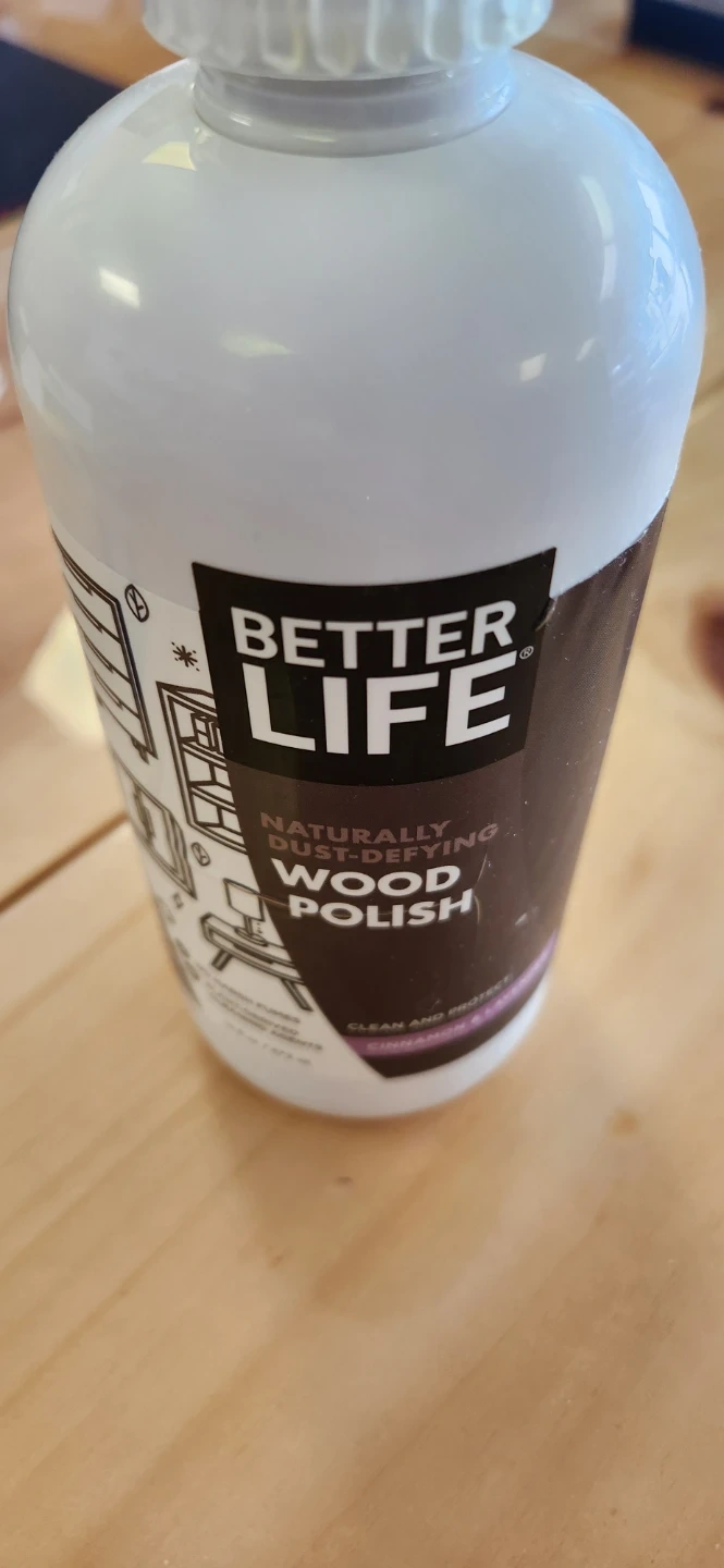 Better Life wood polish cleans and protects your wood surfaces. It's naturally dust-defying! Use it to keep your furniture looking its best.