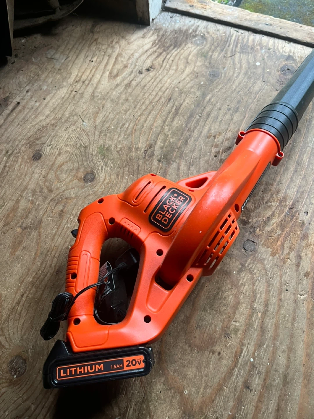 This is a Black+Decker leaf blower. It uses a 20V lithium-ion battery. It's great for clearing debris from your yard!