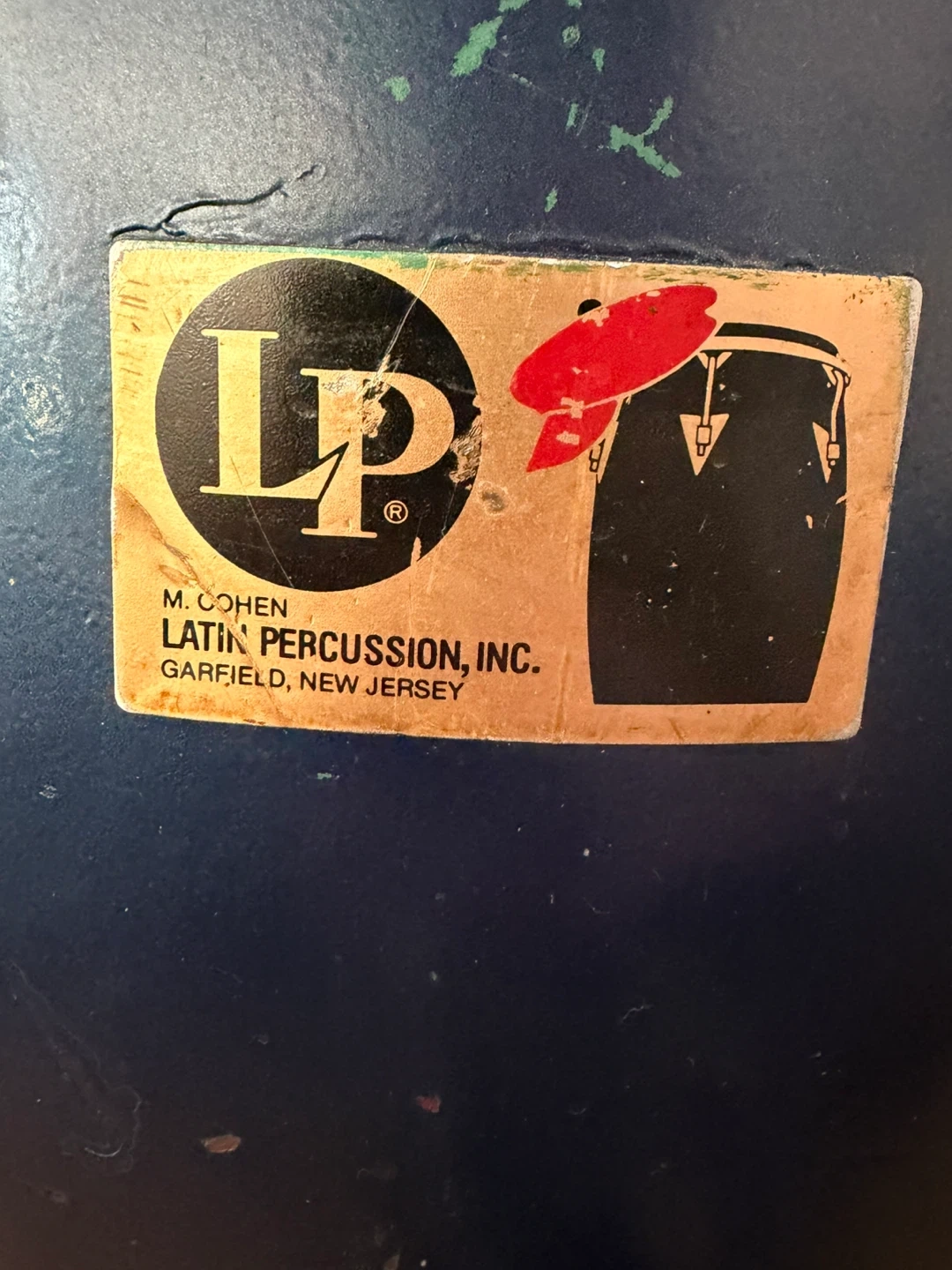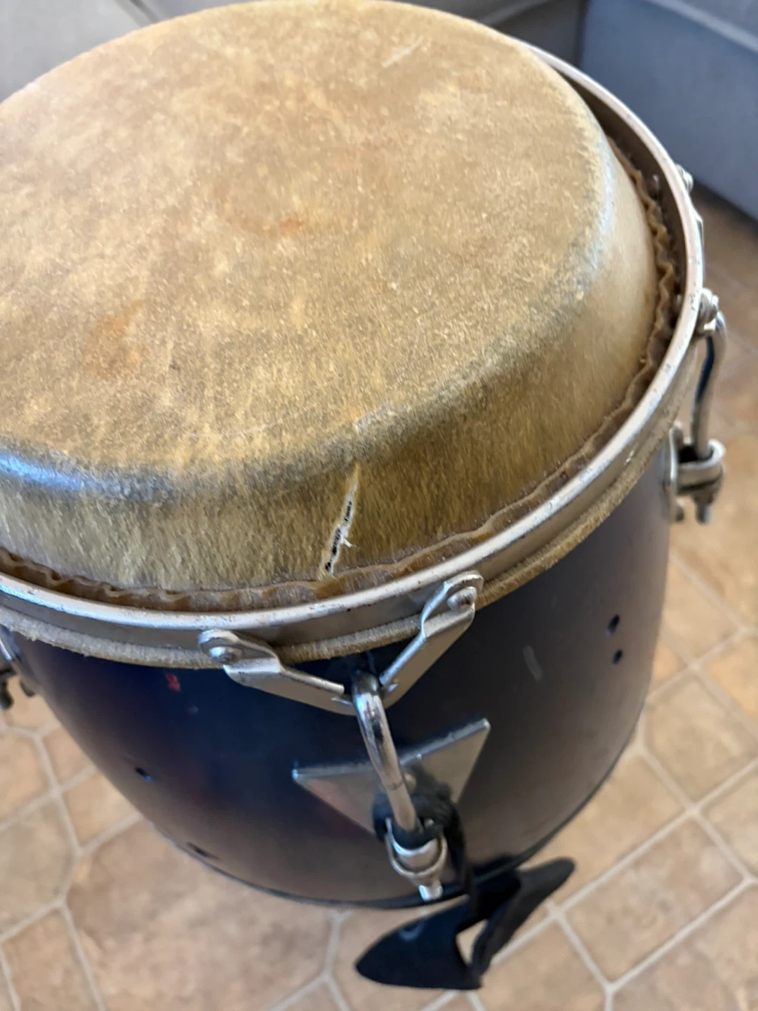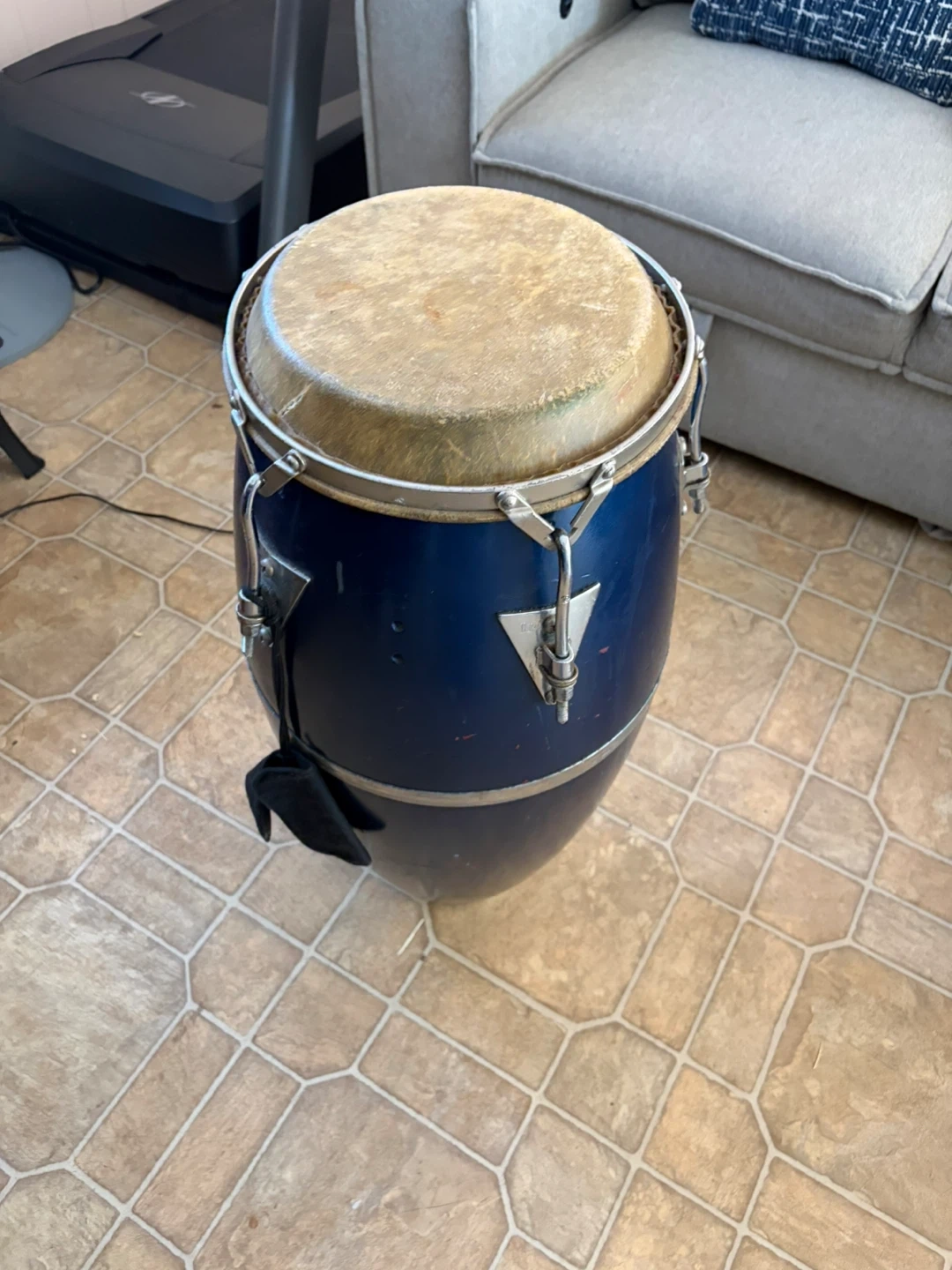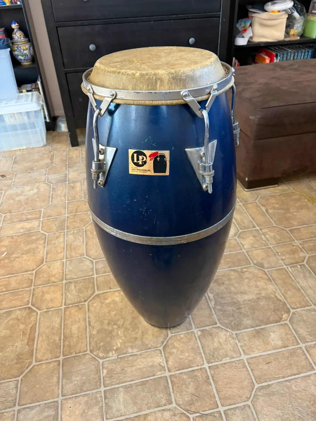 This is an LP conga drum. It's dark blue with a natural rawhide head. Comes with a small black drawstring pouch. Used by Latin Percussion, Inc.