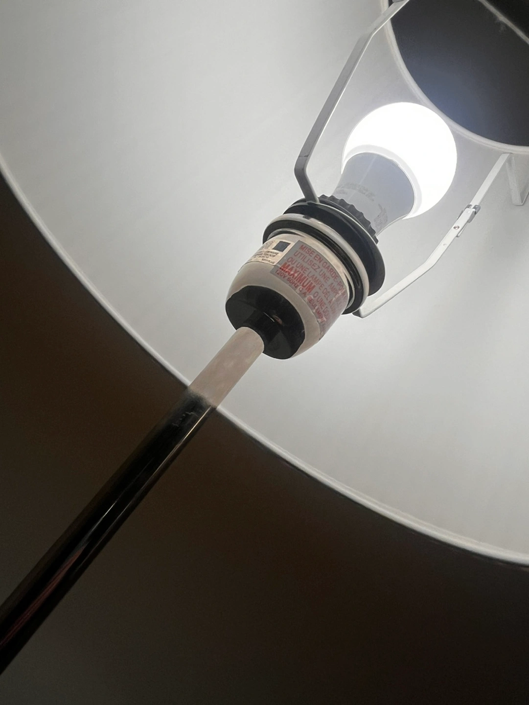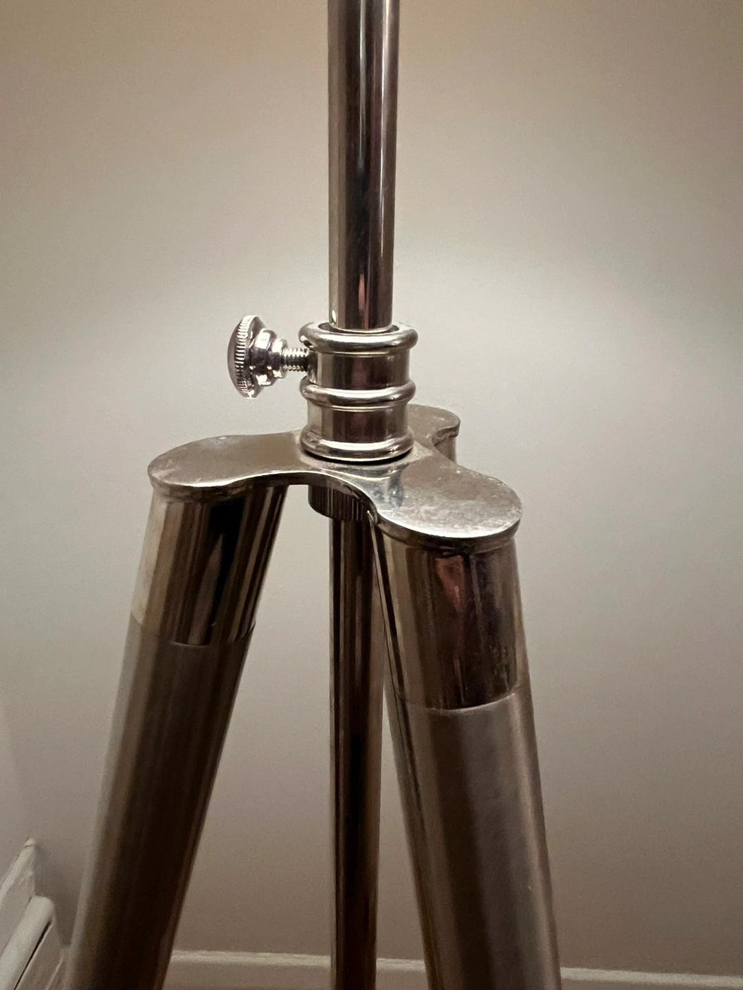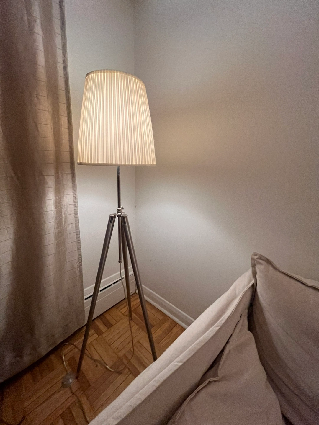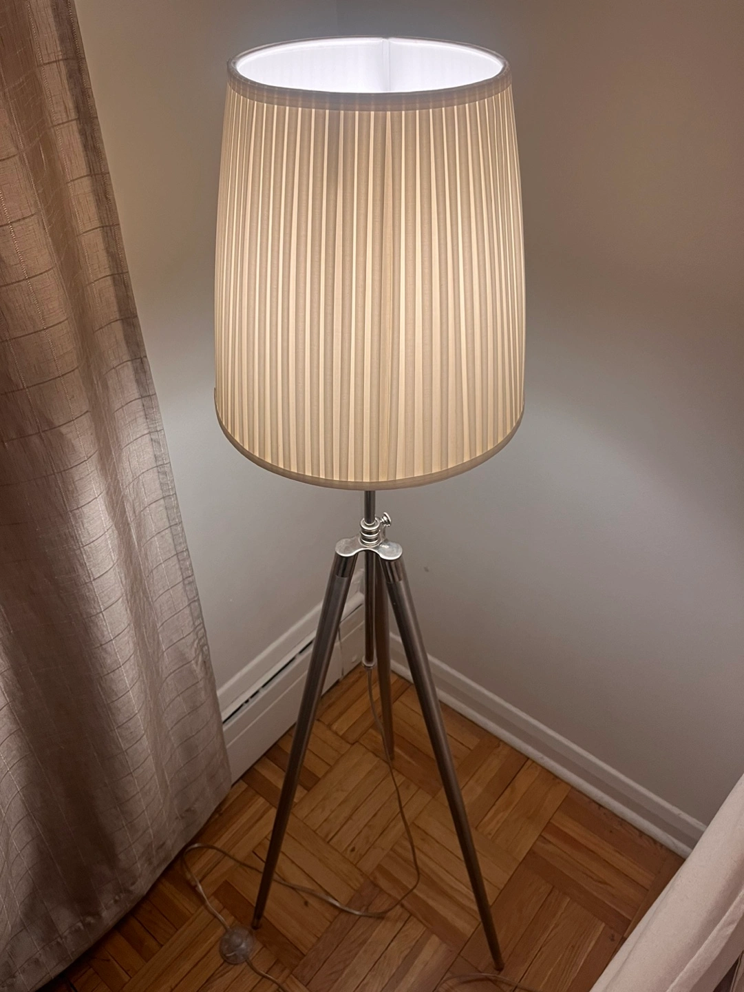 Stylish tripod floor lamp. Features a pleated fabric shade and adjustable height. Metal construction. Excellent for adding ambient lighting to any room.