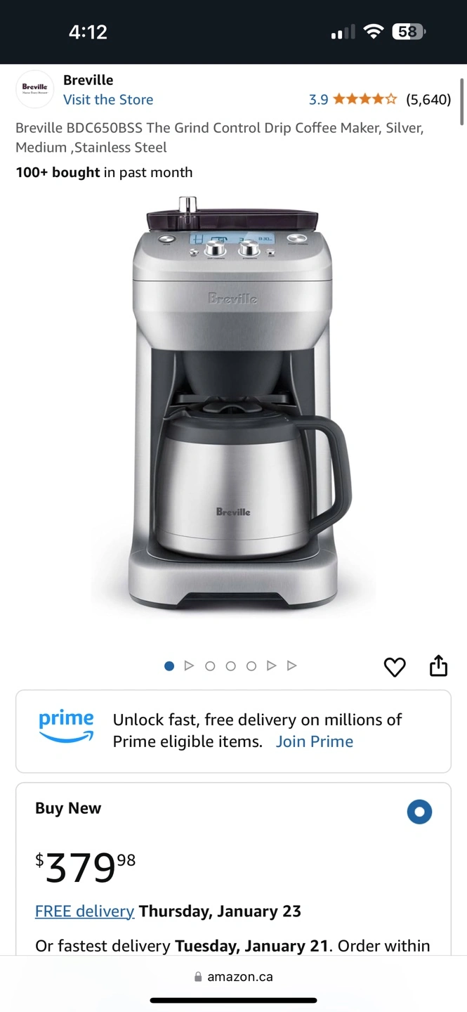 Breville BDC650BSS coffee maker. Stainless steel. Grind control. Medium size.