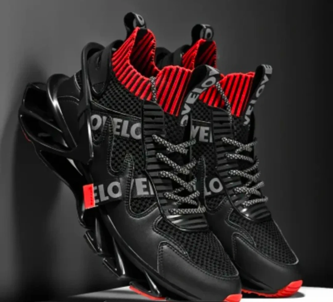 Cool black sneakers with red accents and "LOVE" detailing. These are a unique and stylish pair of shoes that will definitely make a statement!