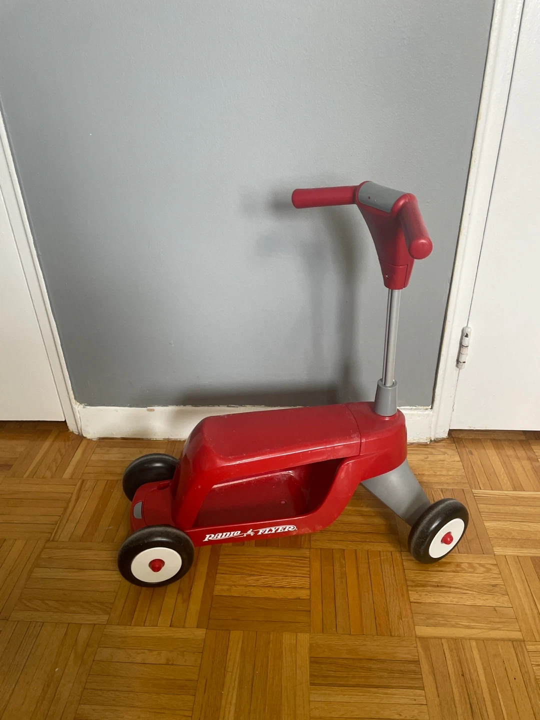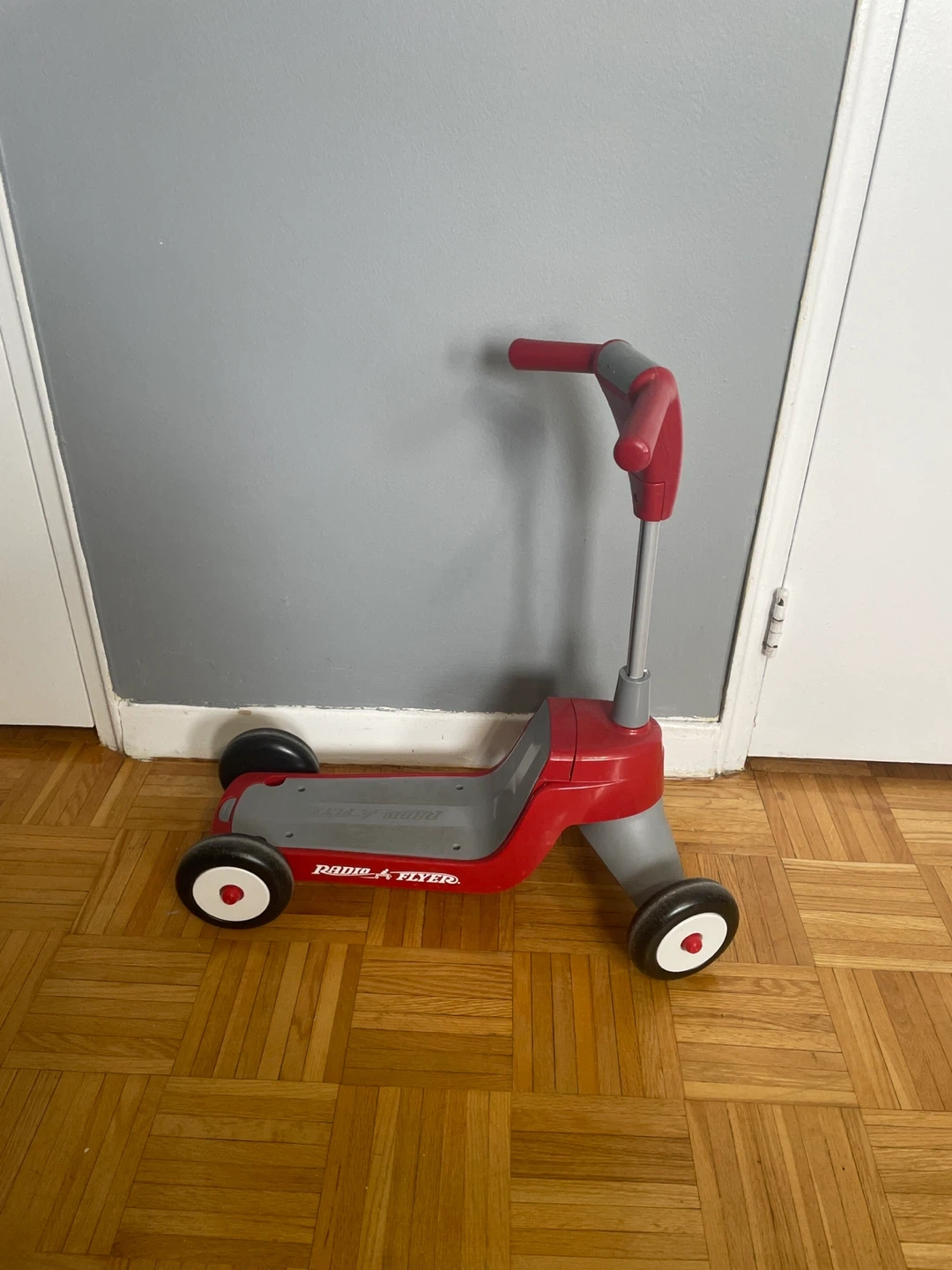 It converts from a tricycle to a scooter. Red and grey