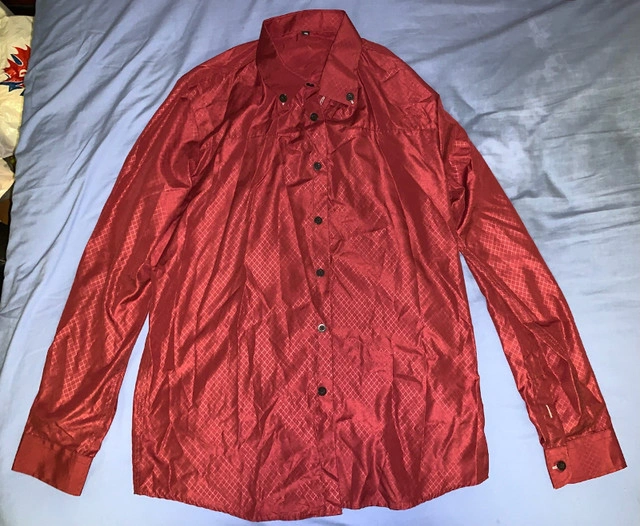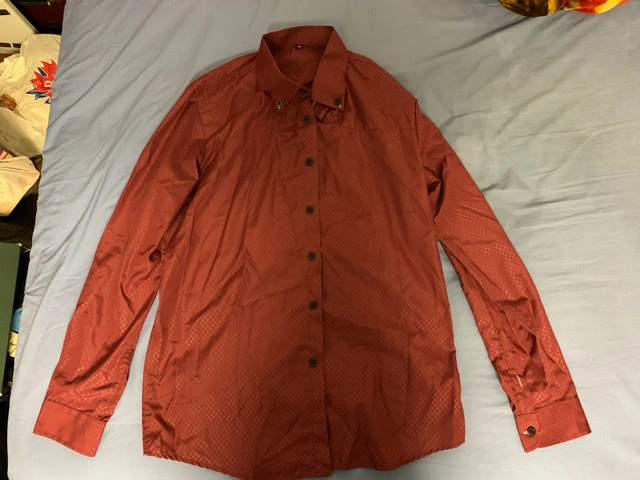 Plaid black and white shirt, measures 94cm all around for chest (size M in North America) Red dress shirt, measures 104cm all around for chest (size L in North America) Like-new condition, kept neatly in storage and washed. Price is for each shirt.
