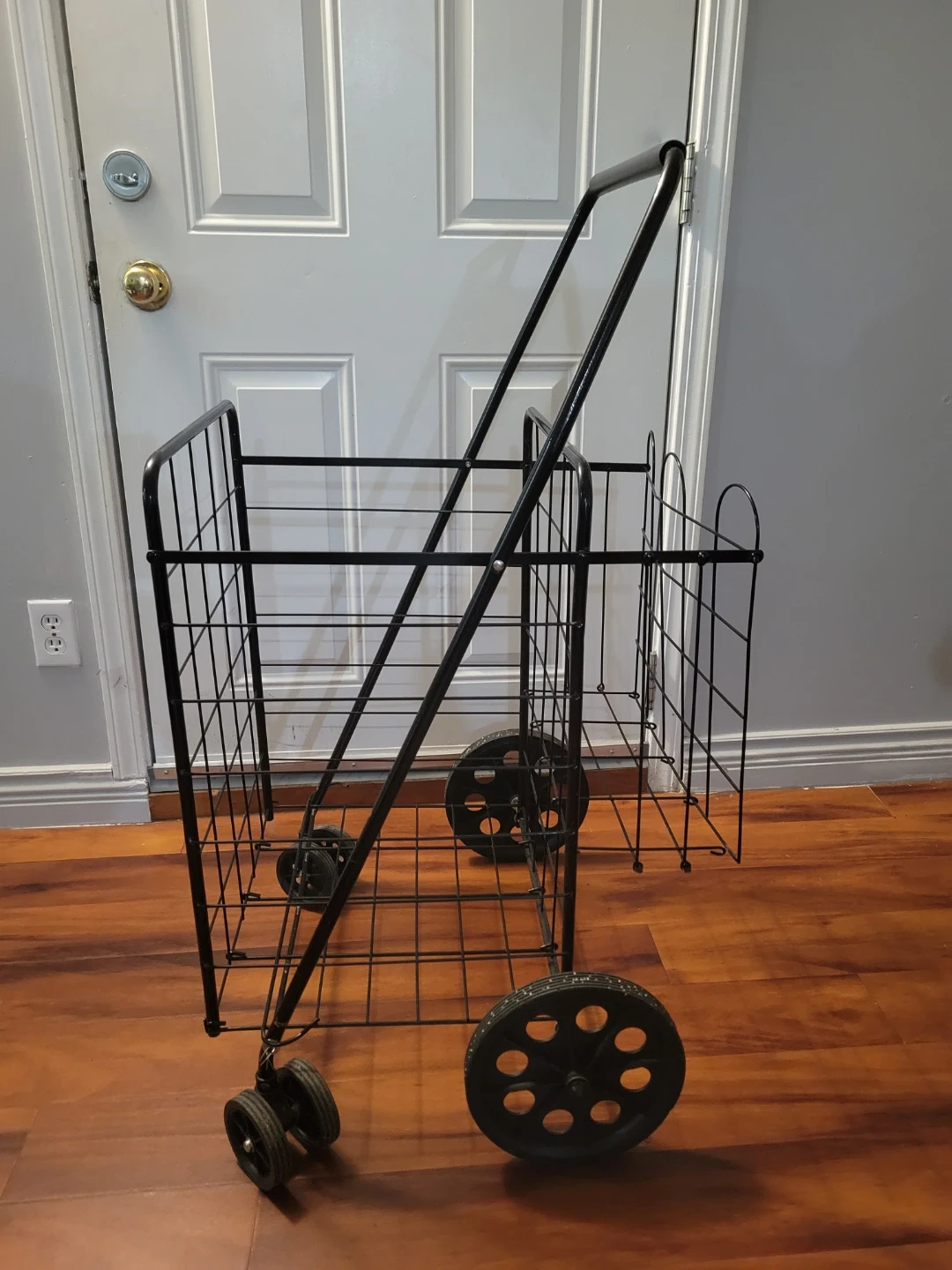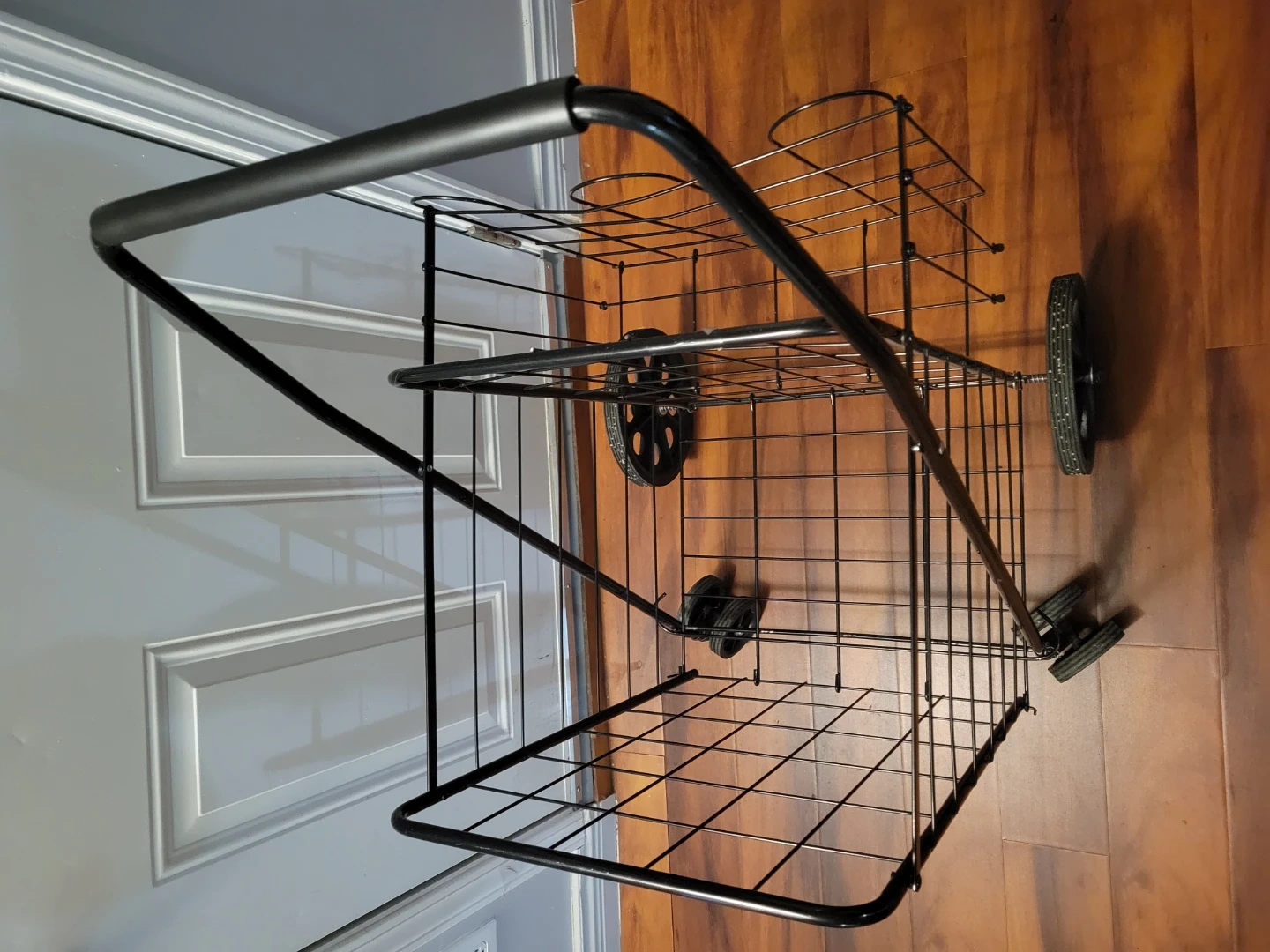 This folding shopping cart is made of black metal. It's great for carrying groceries or other items. The cart folds flat for easy storage. It has a sturdy wire frame and two wheels.
