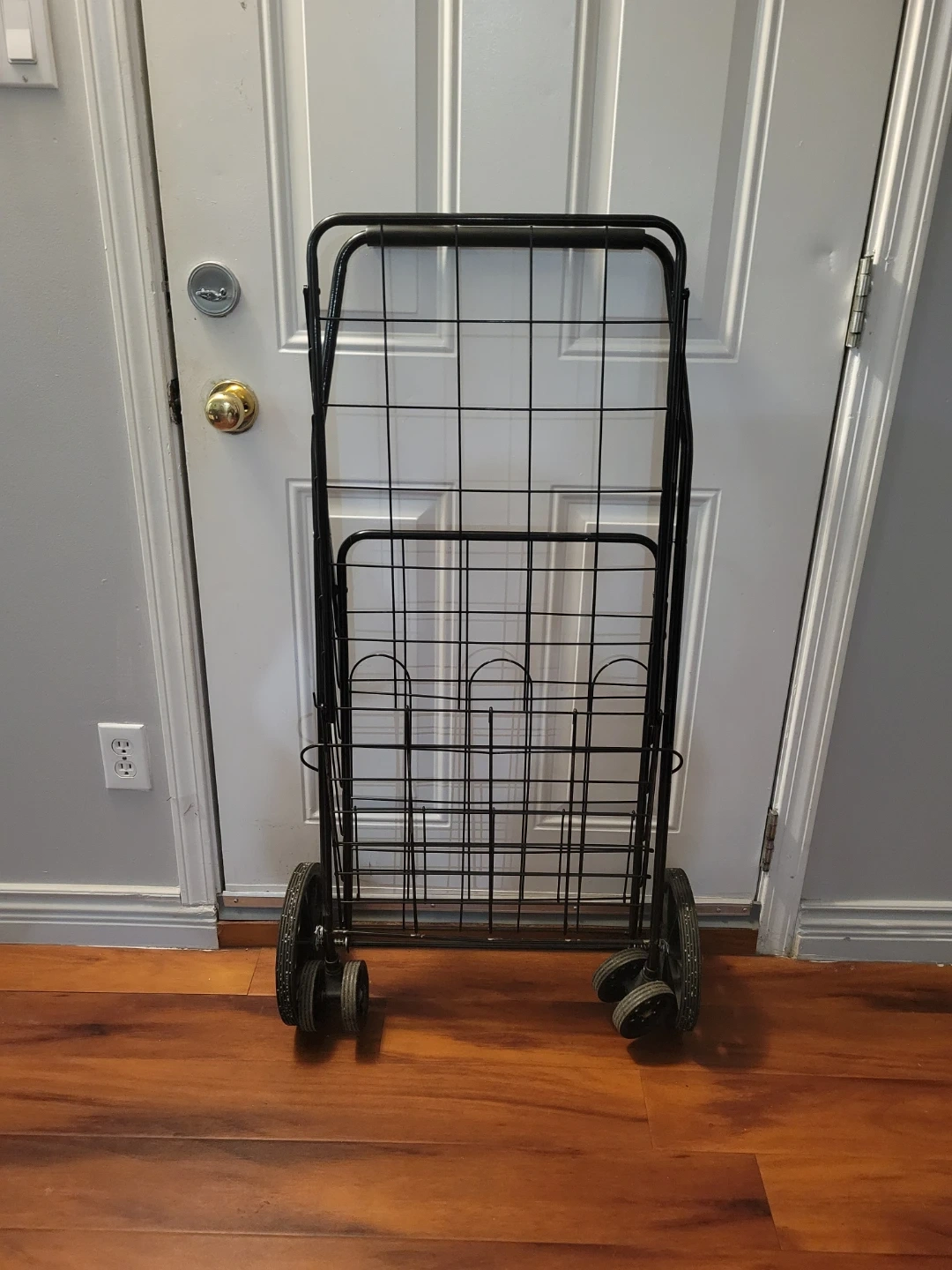 This folding shopping cart is made of black metal. It's great for carrying groceries or other items. The cart folds flat for easy storage. It has a sturdy wire frame and two wheels.