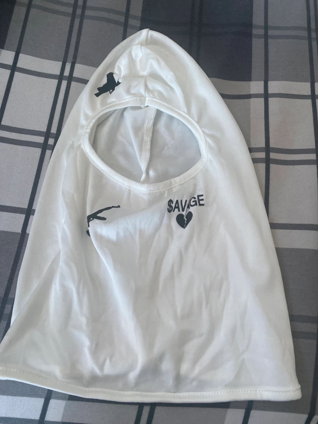 This white balaclava hood features a graphic with the word "$AVAGE" and a broken heart design. It's made of a lightweight fabric, perfect for head and face coverage. It includes an attached hood for extra warmth.