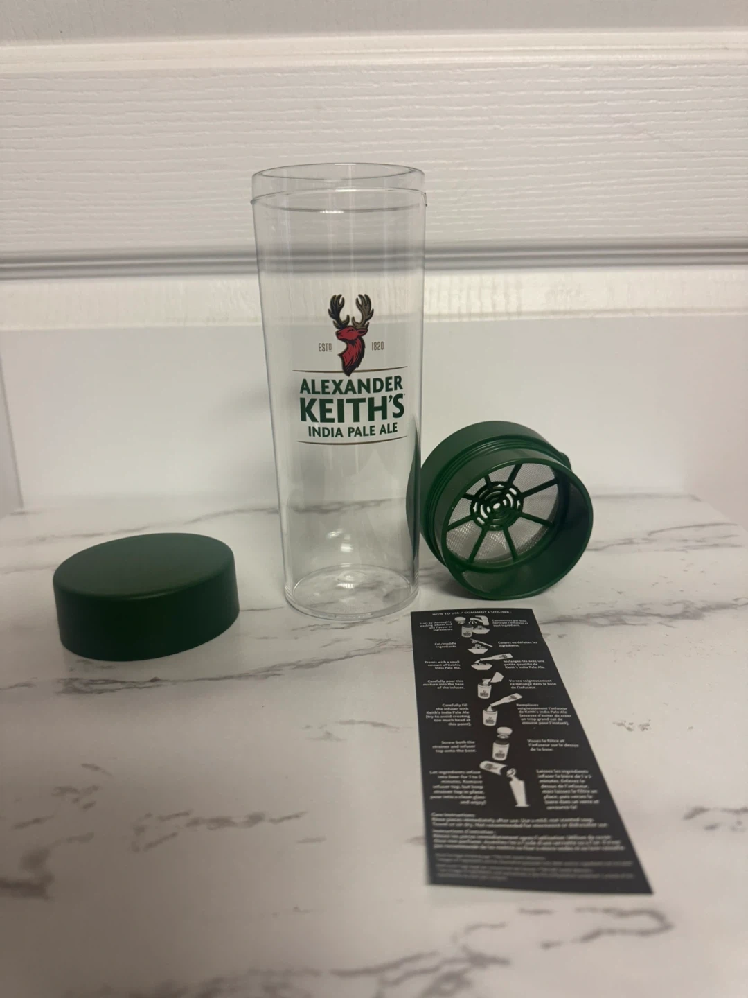 This Alexander Keith's Infuser is made of clear plastic with the Alexander Keith's logo. Includes instructions for use. Can use to infuse a variety of beverages.