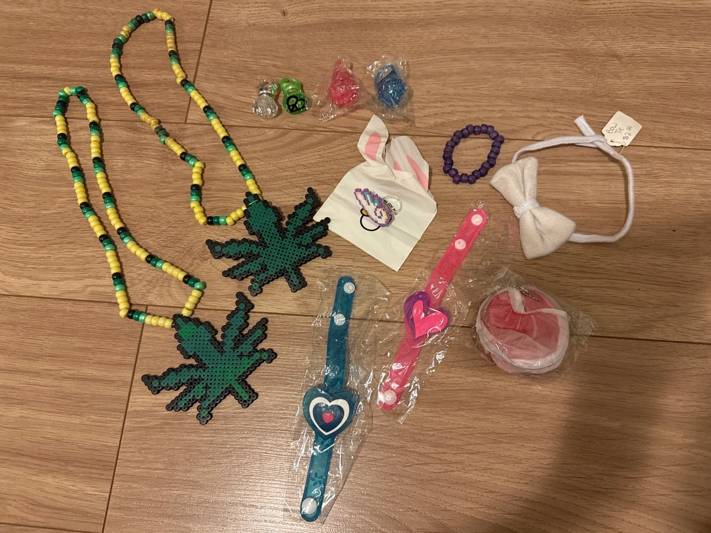 Grab this awesome kandi pack! Includes two beaded necklaces with marijuana leaf pendants, multiple bracelets, keychains, and a cute bow tie. Perfect for festivals or adding to your collection.