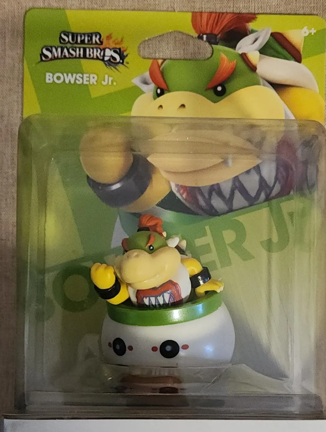 This is a Bowser Jr. Amiibo figure from Super Smash Bros. It's in its original packaging. This collectible figure is great for any Nintendo fan!