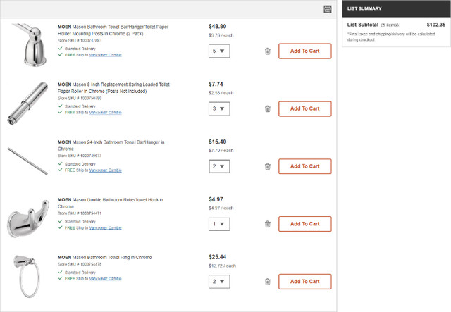 1 / 61 / 6Buy & Sell8 piece Moen Mason collection chrome bathroom hardware8 piece Moen Mason collection chrome bathroom hardware$40Brand new, still sealed in original packaging. Set includes: 3 toilet paper holders, 2 24" towel racks, 1 double robe hook, 2 towel rings.WHERE TO MEETCheck LocationView MapSELLERverifiedDaveStoney Creek731 review0 chats·0 favorites·39 viewsSEND CHAT TO SELLERHi Dave! I’m interested in your listing.Hi Dave! I’m interested in your listing.Get the Karrot app to chatSign In to chat
