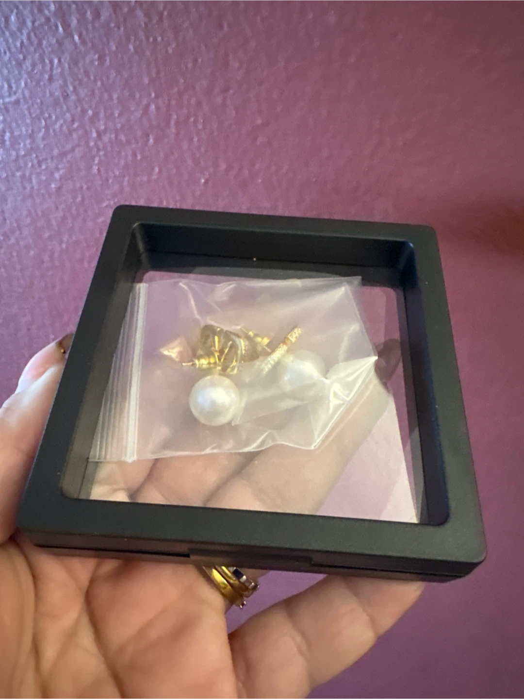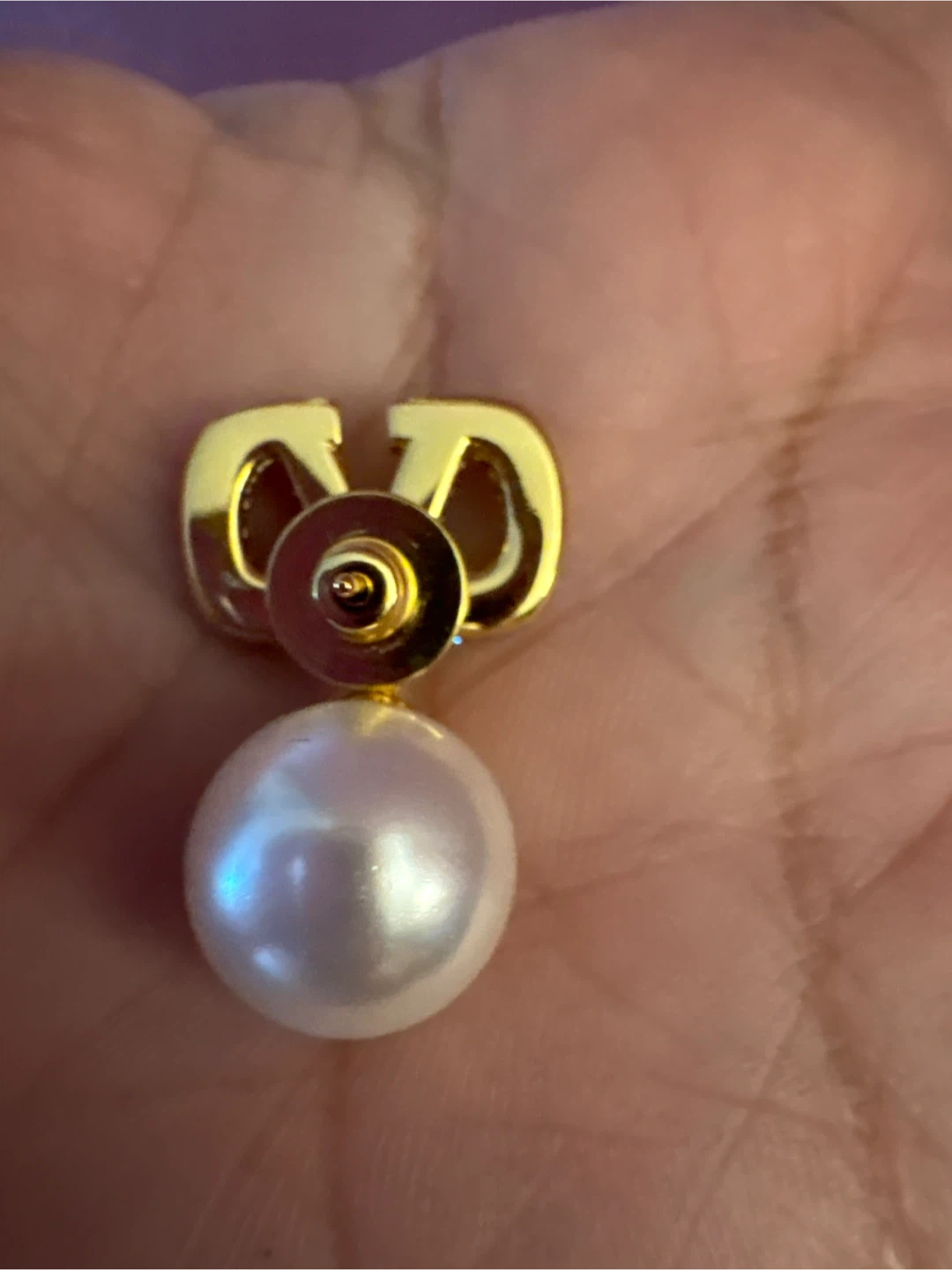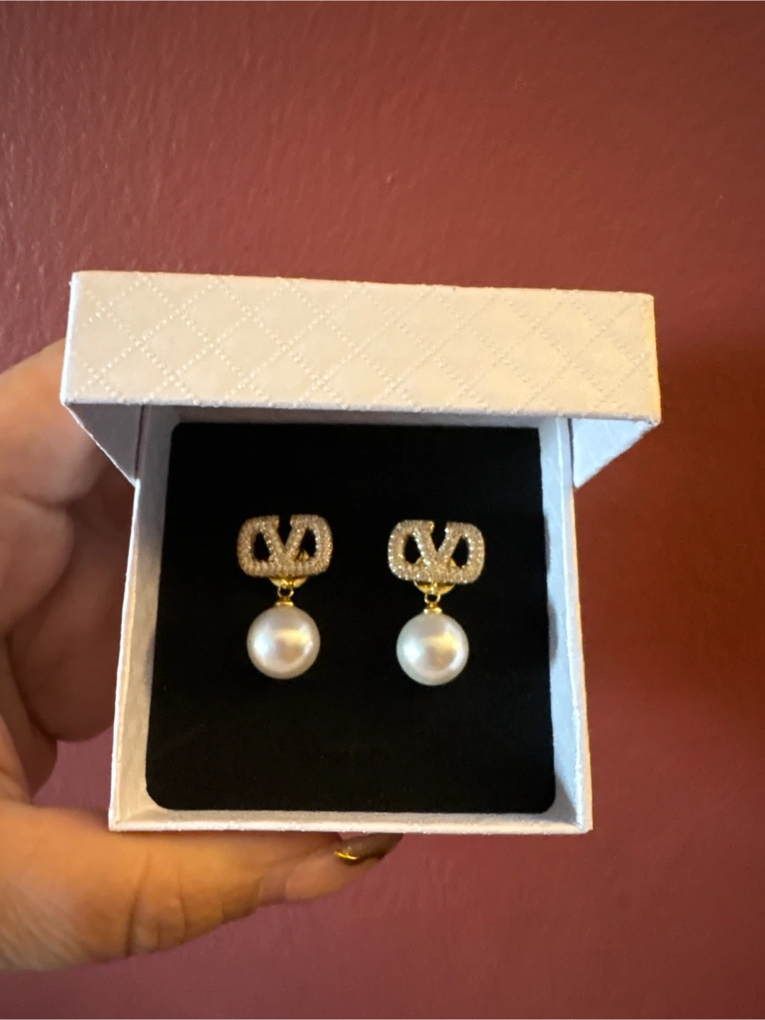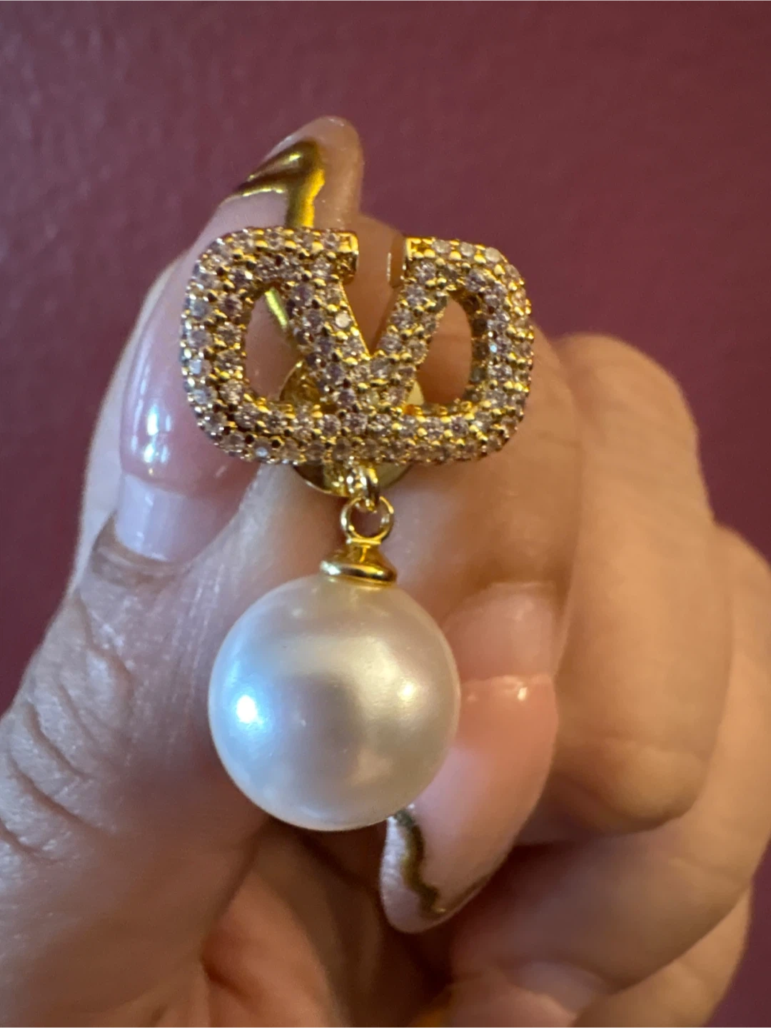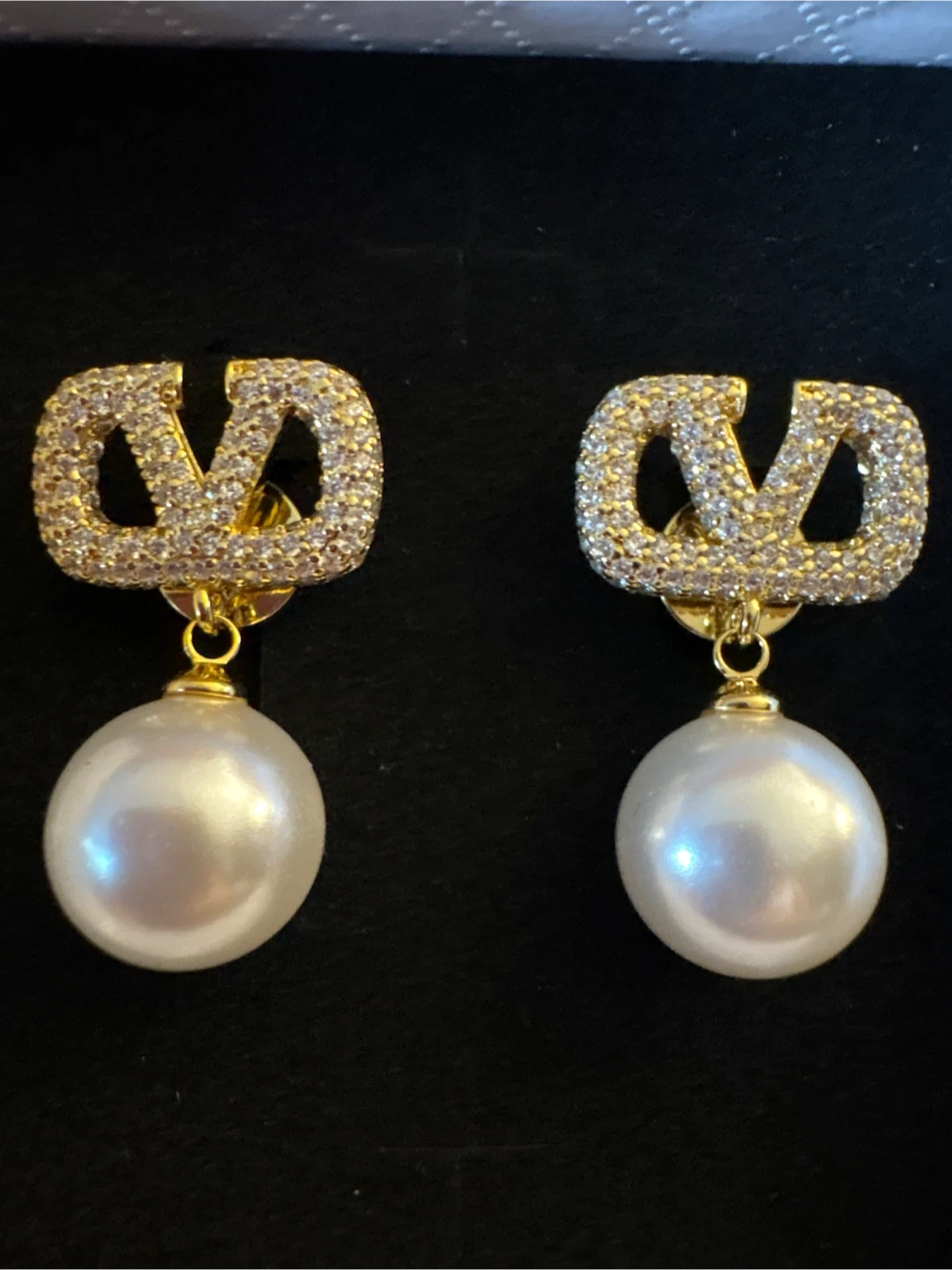 Elegant earrings featuring the V in gold-tone hardware adorned with sparkling crystals. Each earring suspends a lustrous faux pearl. They come presented in their original box.