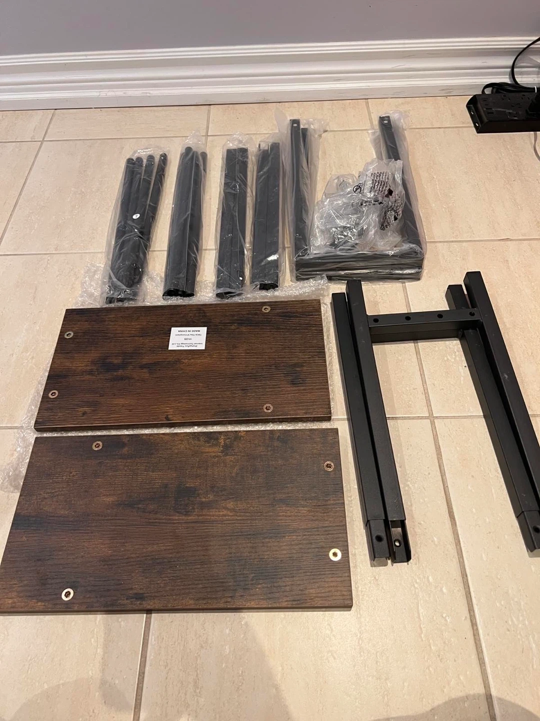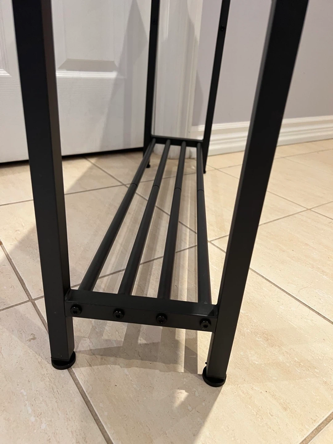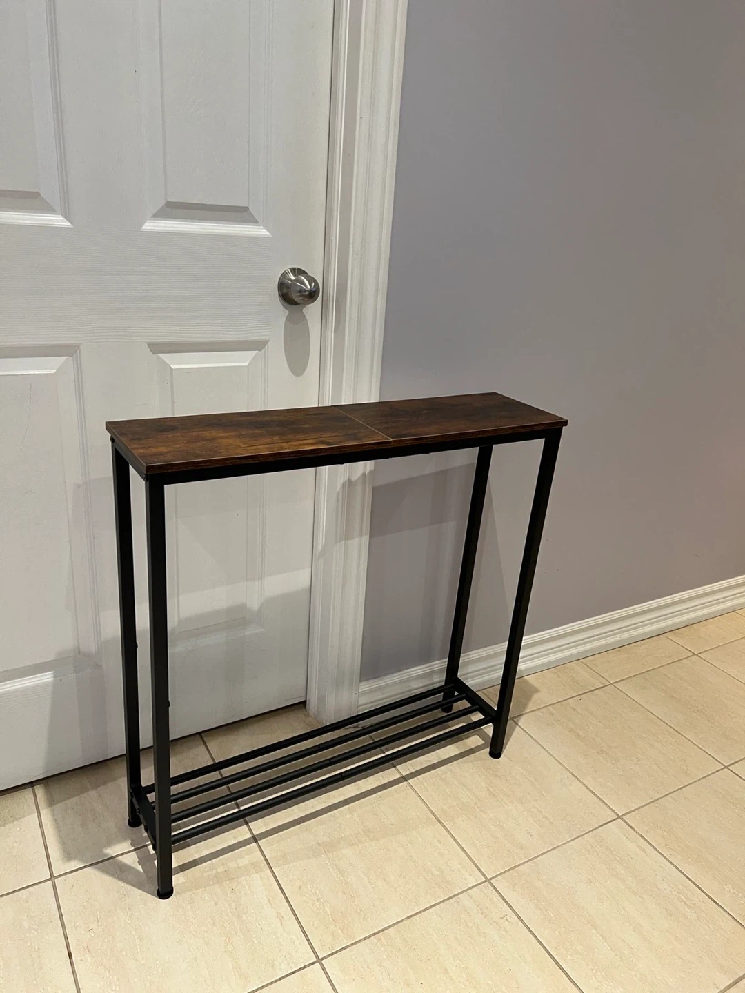 This is a narrow console table with a rustic wood-look top and black metal frame. It has a lower shelf for additional storage. It's a great accent piece for an entryway or hallway!
