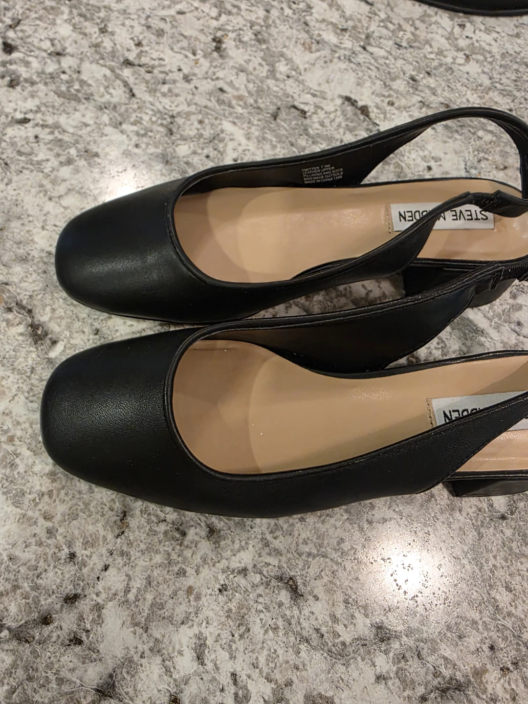 These black Steve Madden slingback heels are a size 7.5M. They feature a leather upper and a comfortable man-made sole. Perfect for dressing up any outfit! Worn once. Purchased for $120