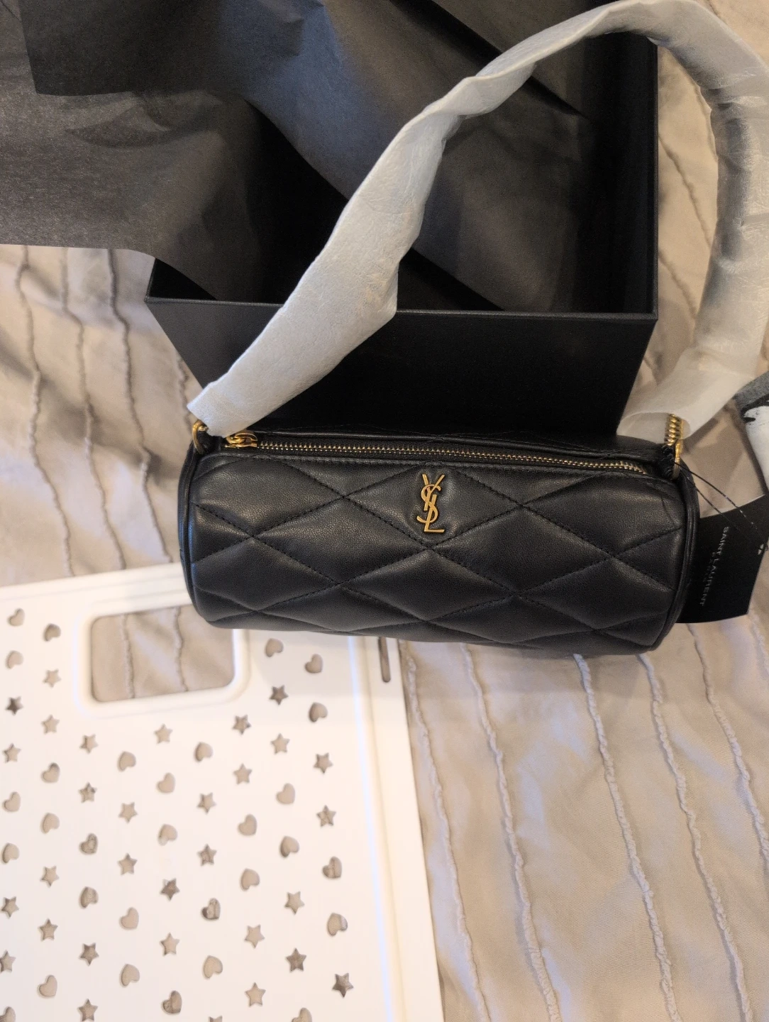 This is a black quilted leather pouch from Saint Laurent. It features a zip closure and the iconic YSL logo. Comes with its original box and dust bag.