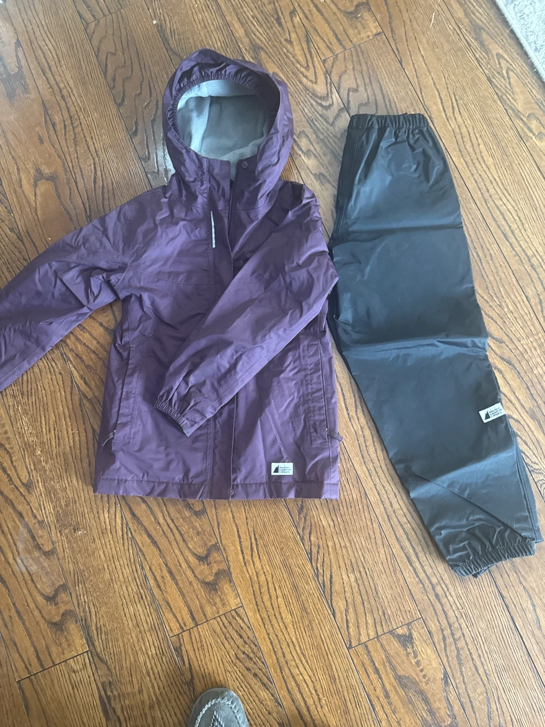 This Mountain Equipment Company rain jacket and pants set is designed for youth. The jacket is purple with a grey fleece lining, and the pants are black. Both are made of waterproof material. It's great for keeping kids dry on rainy days!